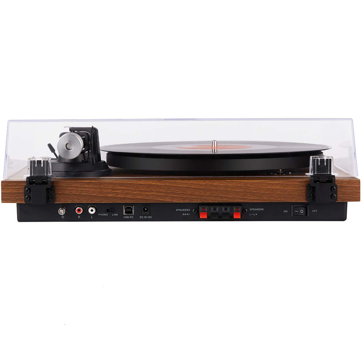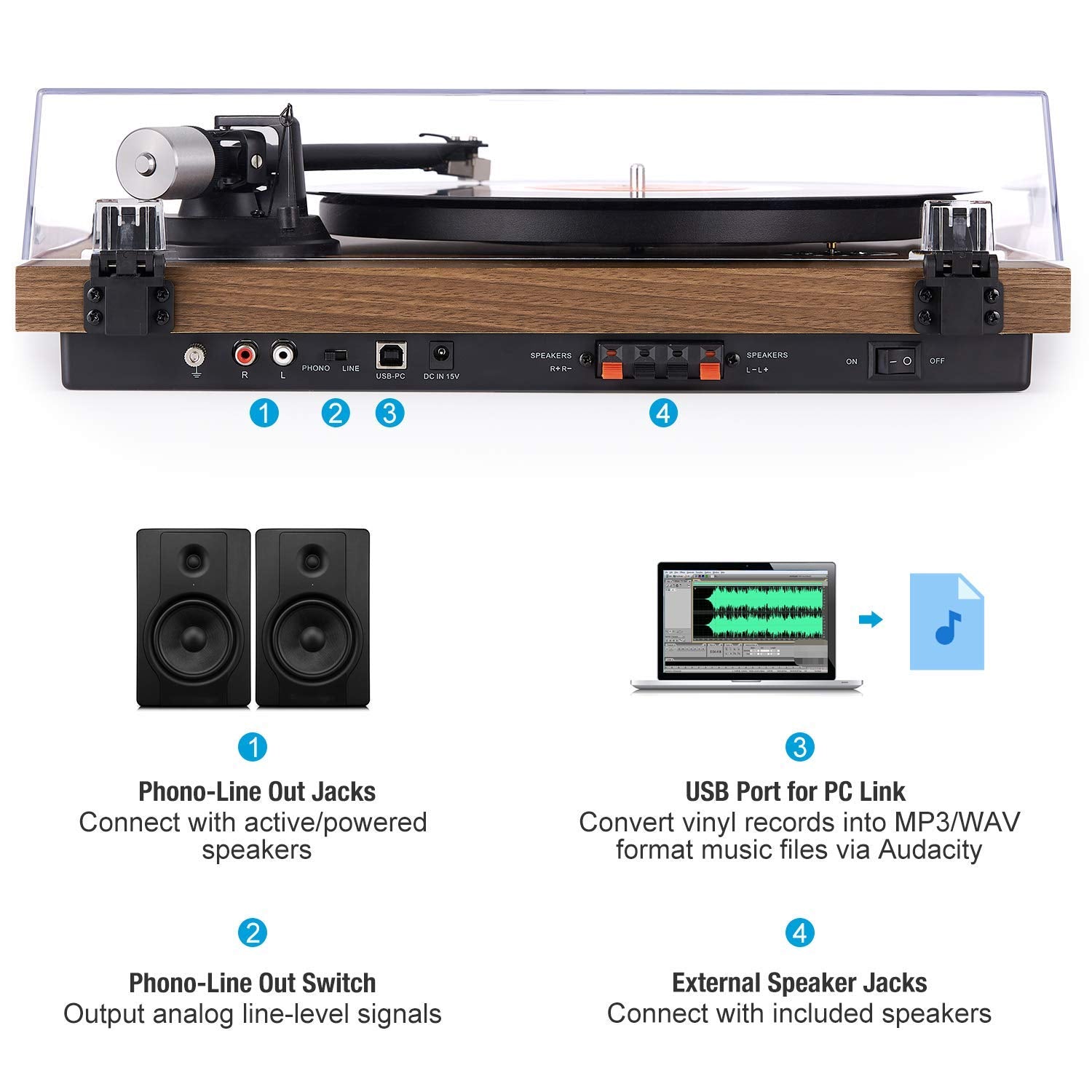 - Flexible Anschlussmöglichkeiten: Dank des integrierten und umschaltbaren Phono-Vorverstärkers können Sie den Plattenspieler mühelos mit externen Lautsprechern oder Ihrer Stereoanlage verbinden, wahlweise über den Phono- oder den AUX-Eingang.