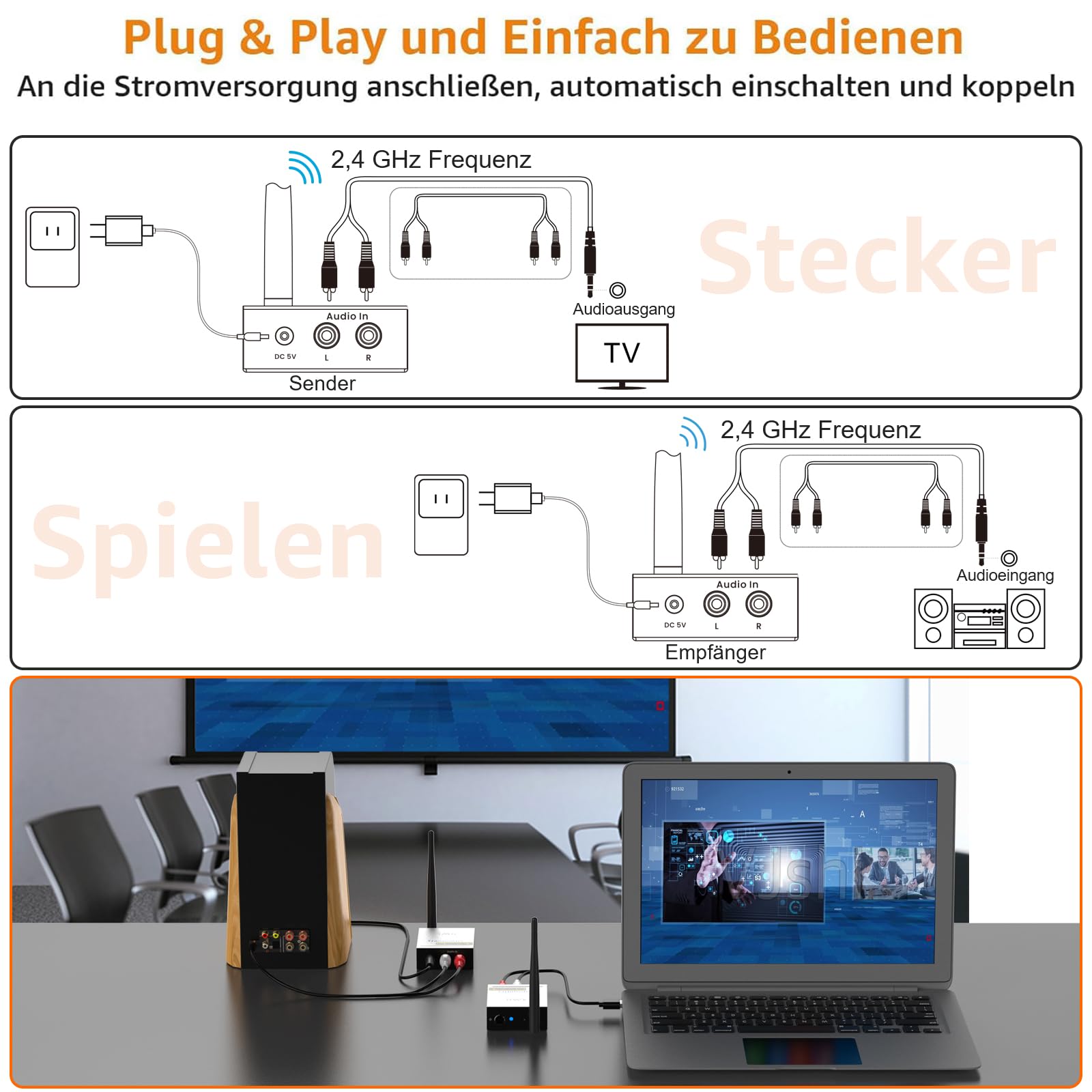 - Kompatibilität: Der Sender verbindet sich mit jeder Audioquelle mit 3.5-mm-AUX- oder Cinch-Ausgang. Der Empfänger kann an jede Stereoanlage oder Aktivlautsprecher mit 3.5-mm-AUX- oder Cinch-Eingang angeschlossen werden.