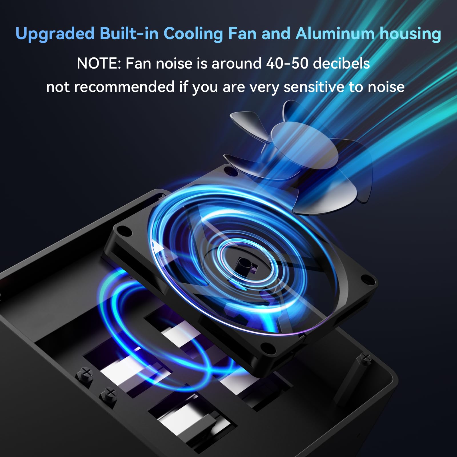 Zuverlässiger Betrieb: Das robuste Aluminiumgehäuse leitet Wärme passiv ab, während der integrierte Lüfter für zusätzliche Kühlung sorgt und so die Lebensdauer Ihrer Festplatten maximiert. Hinweis: Der Lüfter erzeugt ein Betriebsgeräusch von 40-50 Dezibel und wird für sehr geräuschempfindliche Umgebungen nicht empfohlen. Er muss für den Betrieb per USB-Kabel verbunden werden.