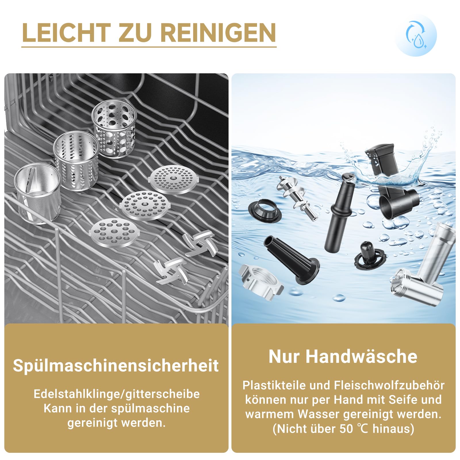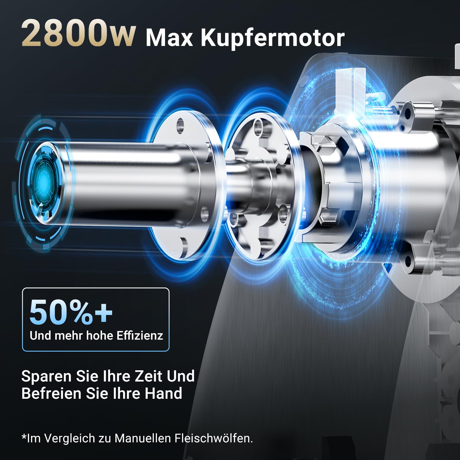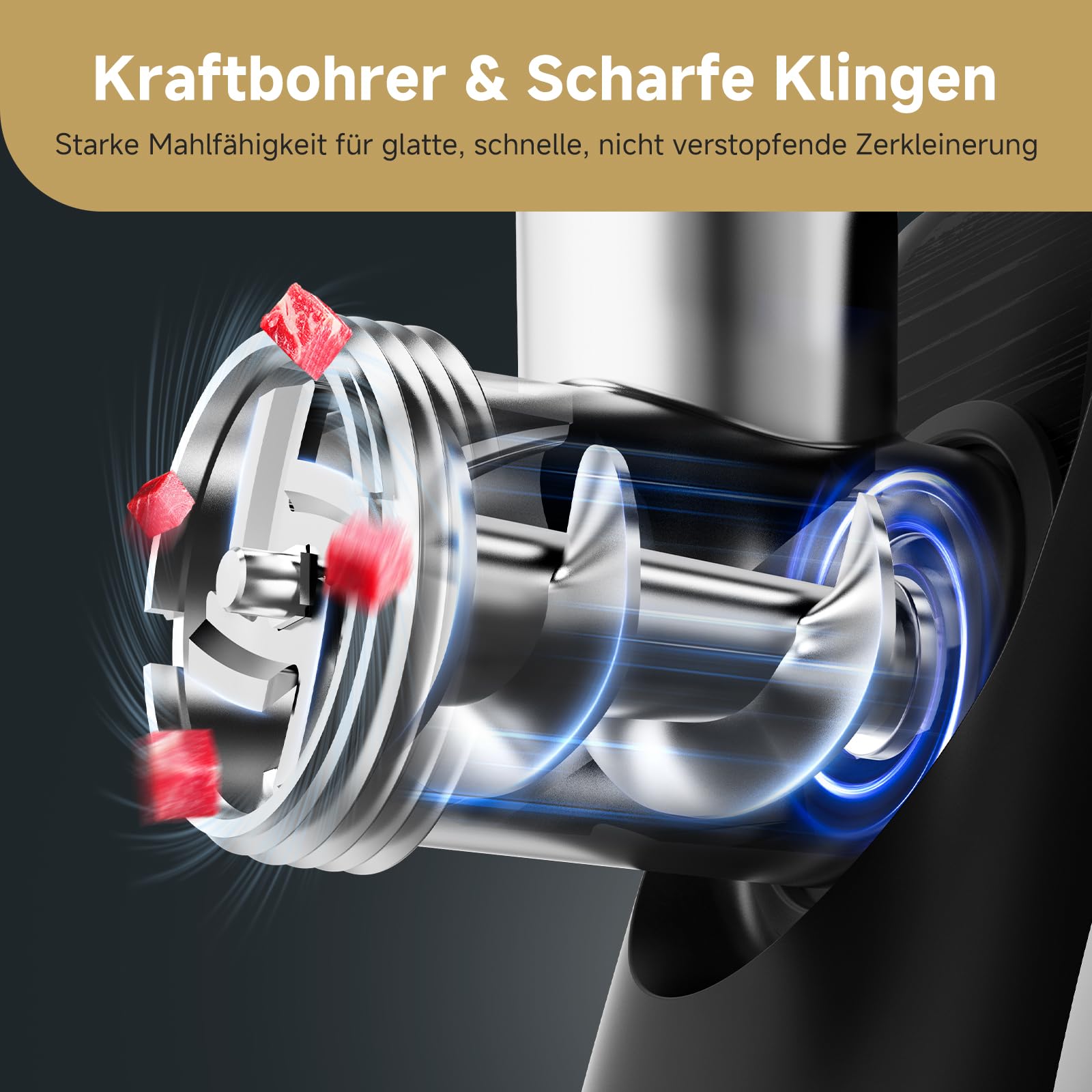 - Hohe Leistung: Ein kraftvoller Motor mit bis zu 2800 Watt Spitzenleistung (300 W Nennleistung) verarbeitet bis zu 1,5 kg Fleisch pro Minute.