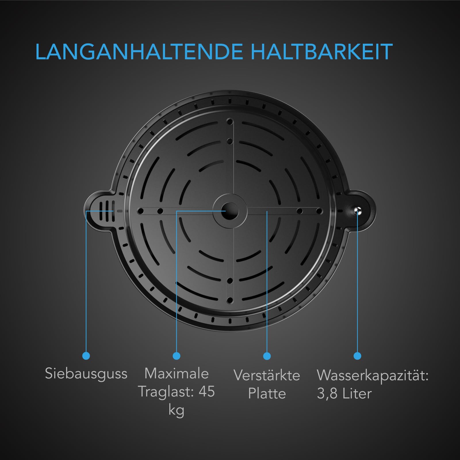 - Praktische Kontrolle: Eine integrierte Wasserstandsanzeige informiert jederzeit über den Füllstand, während der Siebausguss ein schnelles und sauberes Nachfüllen ermöglicht.