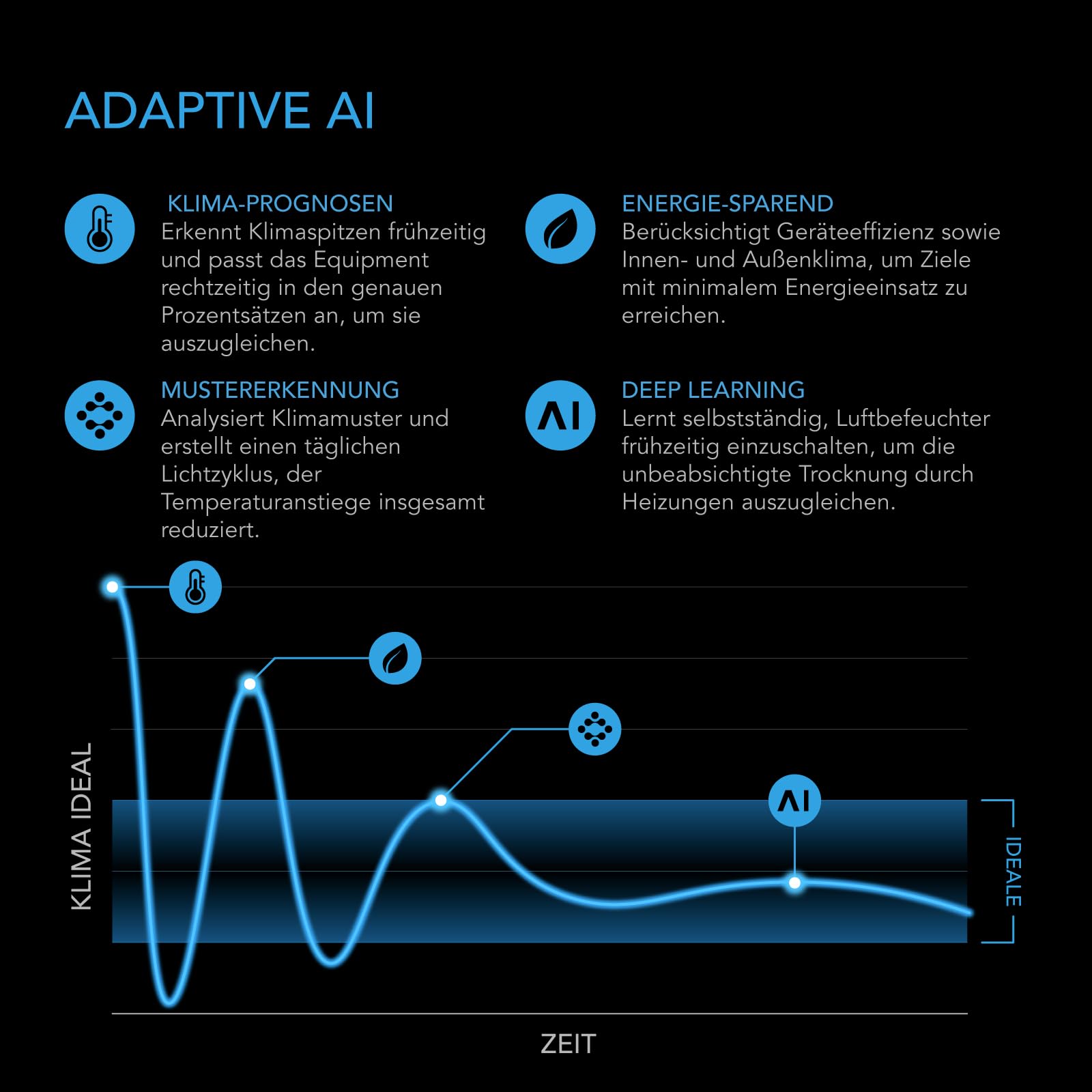 - Die künstliche Intelligenz wertet Klimadaten aus, prognostiziert extreme Werte und passt die Leistung der Geräte dynamisch an, um jederzeit ein stabiles und optimales Umfeld zu gewährleisten.