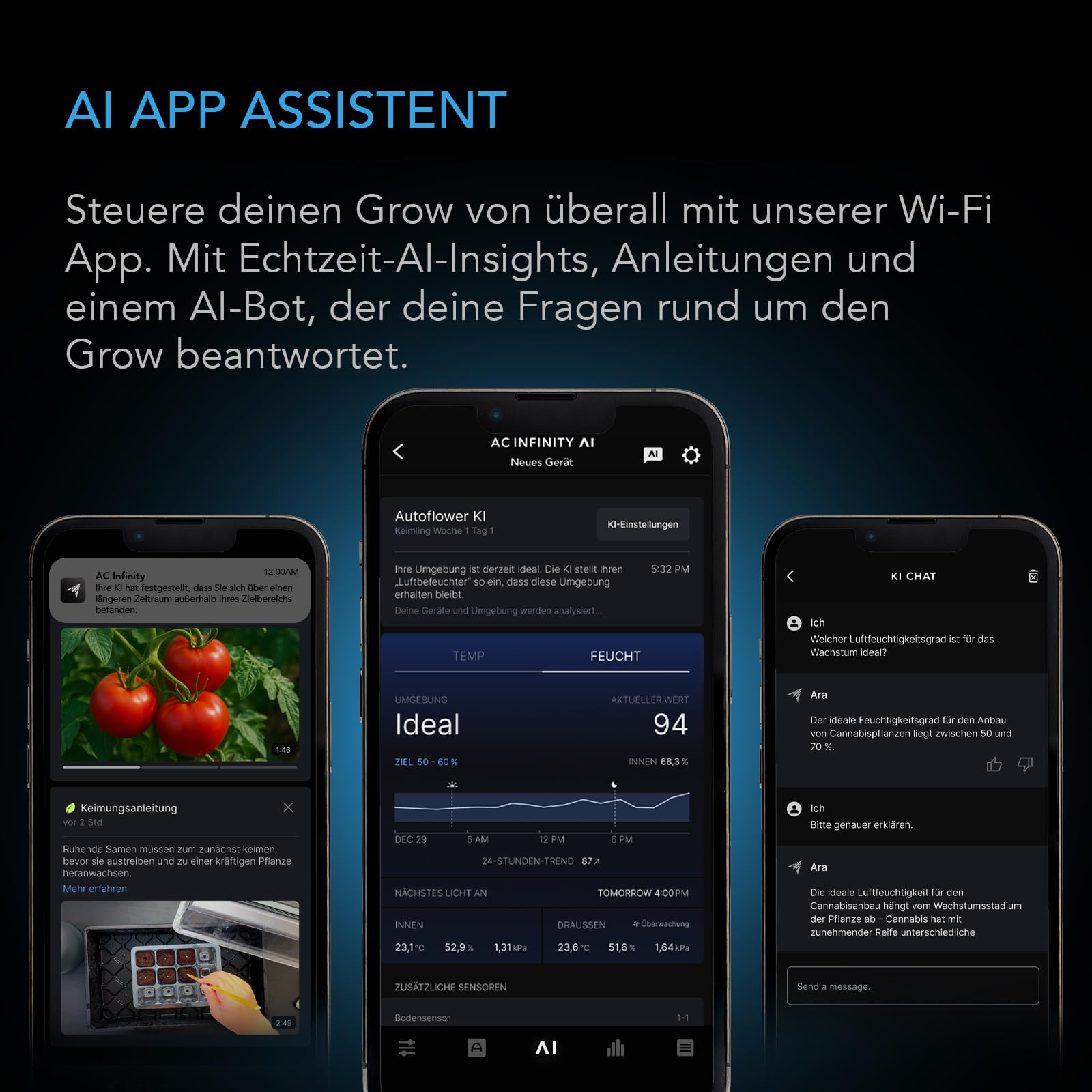 - Vollständige Fernsteuerung via WLan-App: Erhalten Sie von überall Zugriff auf Echtzeit-Analysen, Benachrichtigungen, Diagramme und einen interaktiven KI-Bot für Fragen rund um Ihren Anbau.