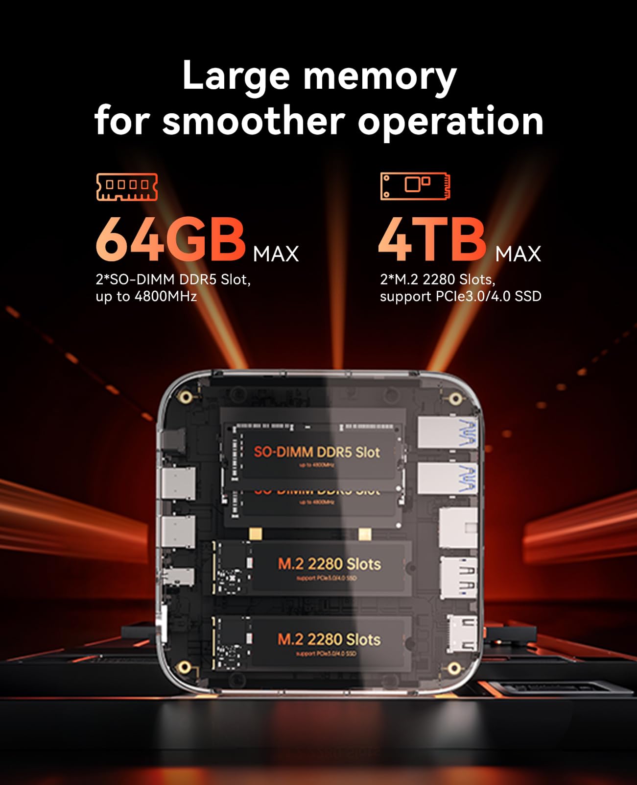 Angetrieben vom AMD Ryzen 7 6800H Prozessor mit Zen 3+ Architektur bewältigt dieser Mini-PC mühelos alles von anspruchsvoller Büroarbeit über Multimedia-Streaming bis hin zu gängigen Online-Spielen. Erleben Sie eine konstant flüssige und reaktionsschnelle Performance bei all Ihren Anwendungen.
