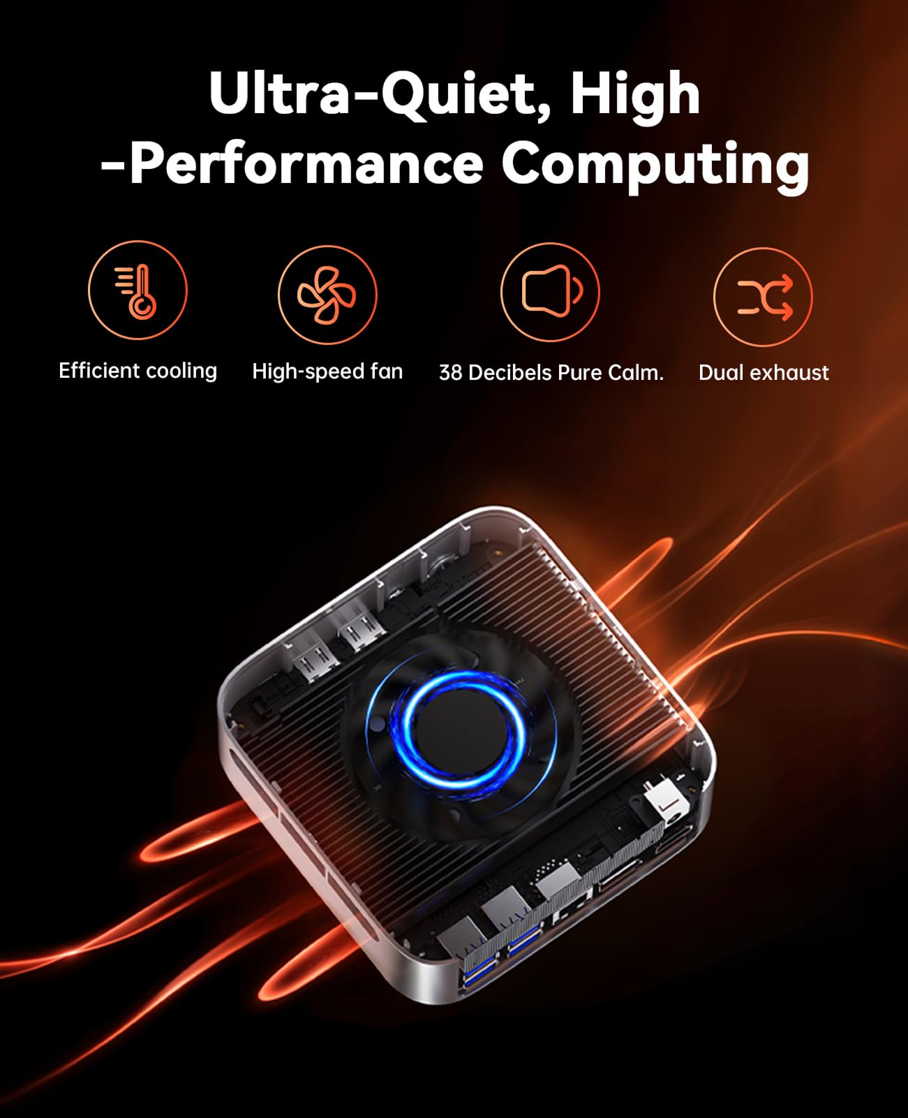 Ein intelligentes Kühlsystem mit gezielter Luftführung sorgt dafür, dass der Mini-PC auch unter Volllast kühl und leise bleibt. Dies garantiert eine stabile Leistung ohne hitzebedingte Drosselung, selbst bei langen Arbeitssitzungen.