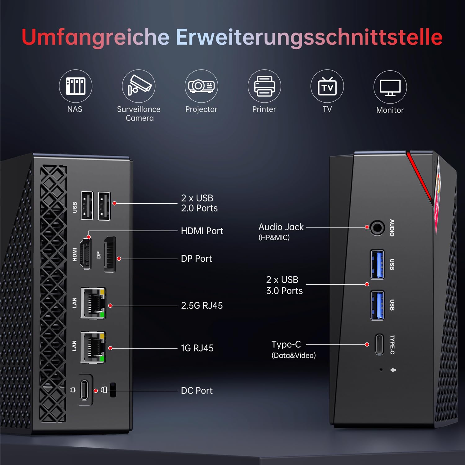 - Anschlüsse: 4K Triple-Display-Unterstützung (HDMI, DP, Type-C), Dual Ethernet (2.5G & 1G), Wi-Fi 6, Bluetooth 5.2, USB 3.0 & 2.0