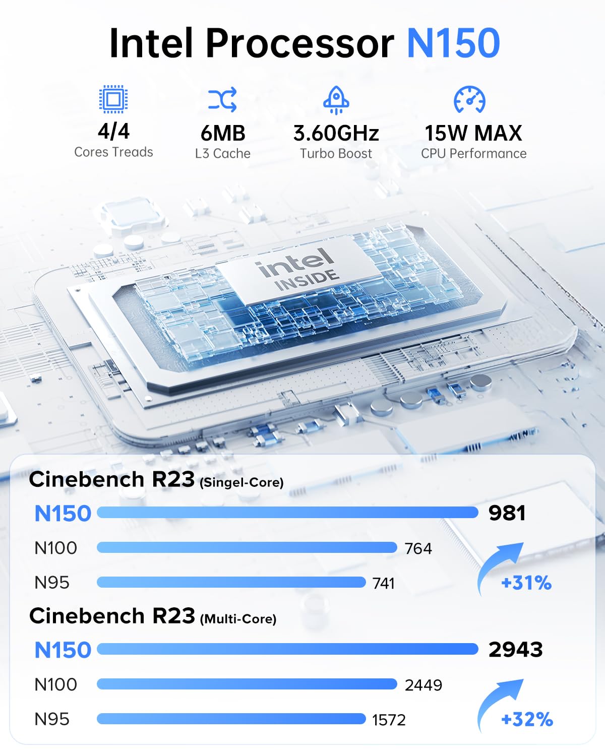 - Prozessor: Intel Twin Lake N150 der neusten Generation (bis zu 3,6 GHz)