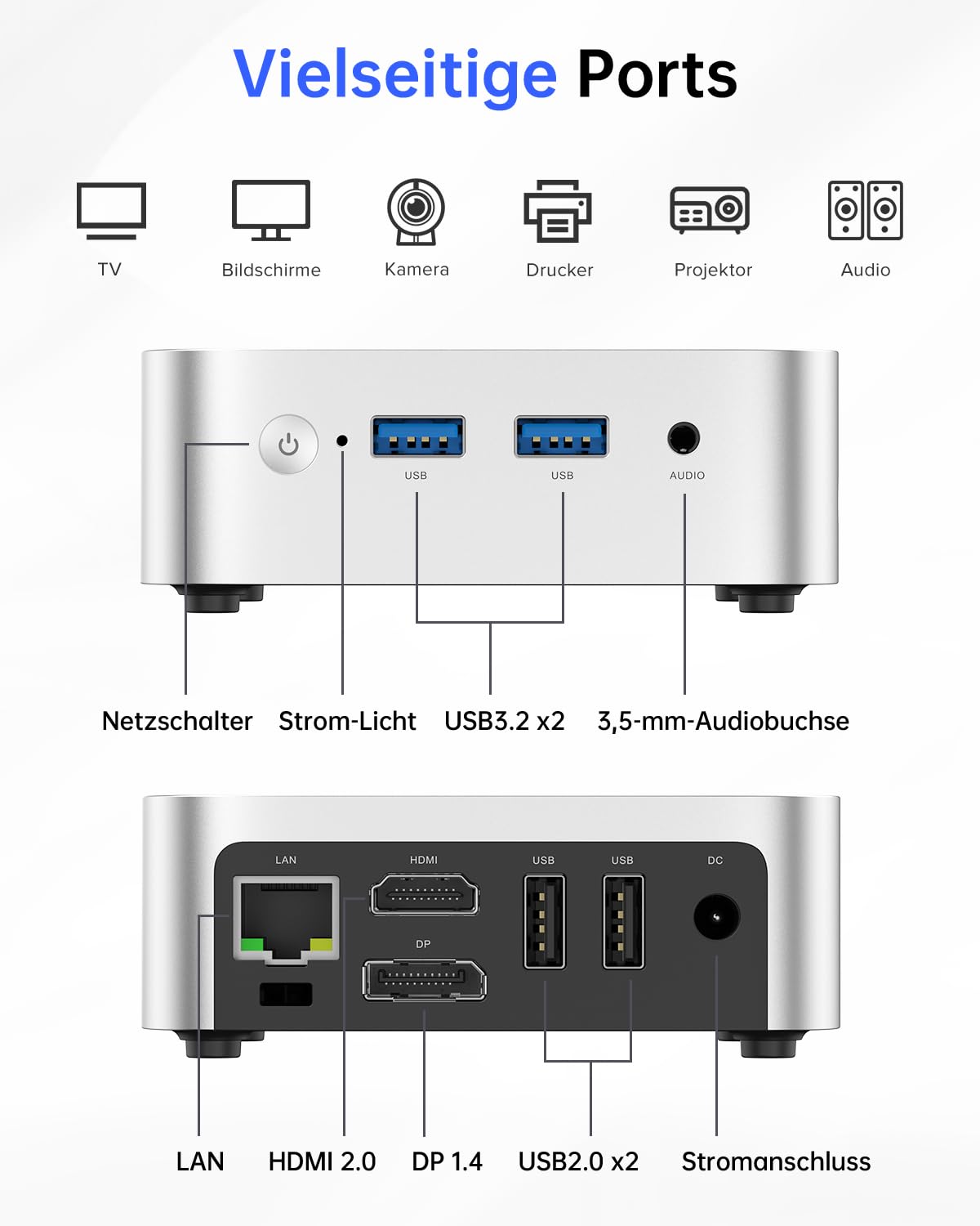 Ja, der Mini-PC ist für maximale Produktivität ausgelegt. Sie können über die HDMI 2.0- und DisplayPort 1.4-Anschlüsse problemlos zwei 4K-Monitore gleichzeitig betreiben und so Ihre Arbeitsfläche erheblich vergrössern.
