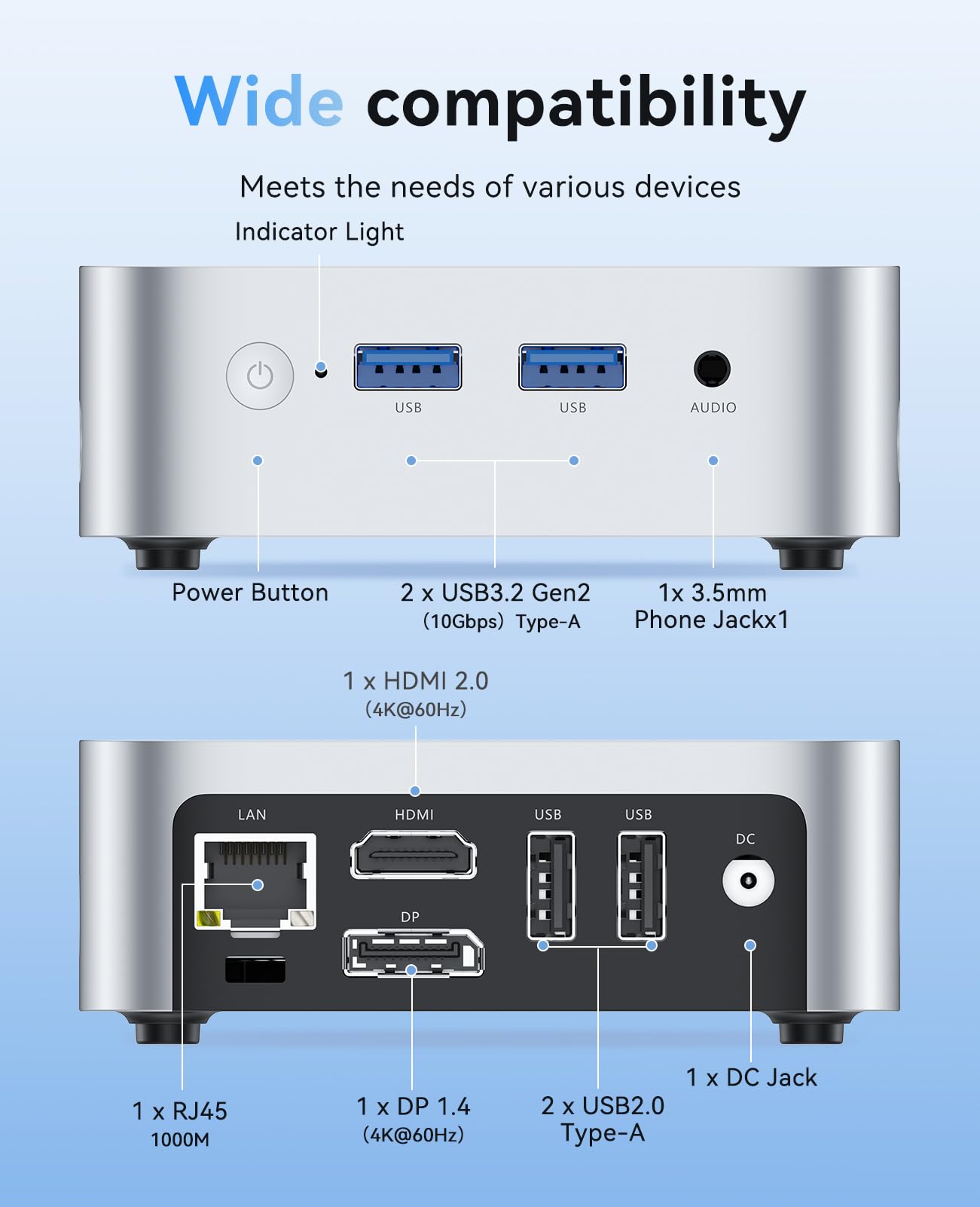 Der ACEMAGICIAN Vista Mini V1 ist ideal für Büro-, Heim- und Schulaufgaben. Dank des Intel N97 Prozessors und 16 GB RAM bewältigt er mühelos anspruchsvolle Office-Anwendungen, 4K-Videostreaming, Web-Browsing und alltägliches Multitasking.
