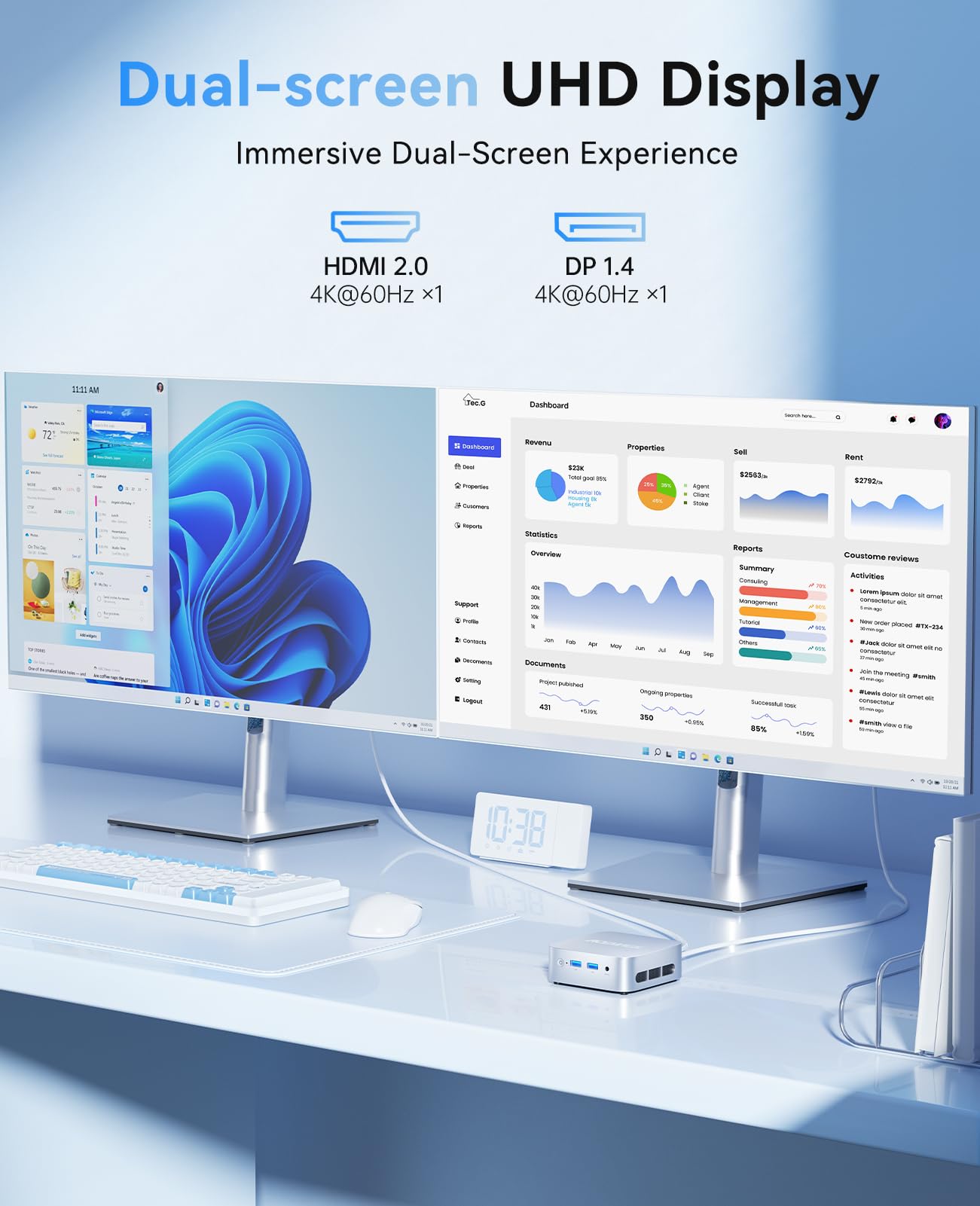 Sie können bis zu zwei Monitore gleichzeitig anschliessen und eine 4K-Auflösung geniessen. Der Mini-PC verfügt über einen HDMI 2.0 Anschluss und einen DisplayPort 1.4 Anschluss, um Ihre Produktivität auf einem Dual-Display-Setup zu maximieren.