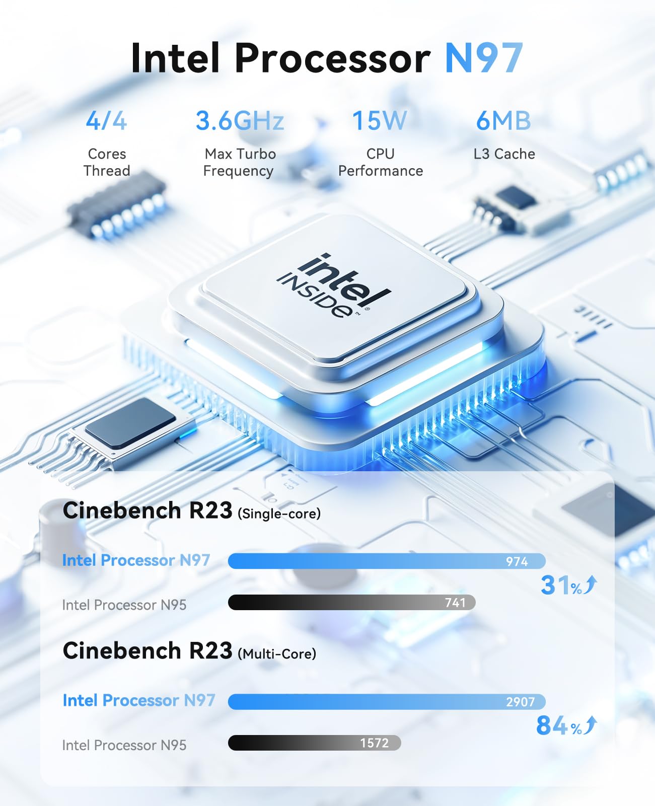 - Leistungsstarker Prozessor: Ausgestattet mit dem Intel Alder Lake N97 Prozessor (bis zu 3.60 GHz, 4 Kerne), der eine signifikant höhere Leistung als die N95- und N100-Modelle bietet.