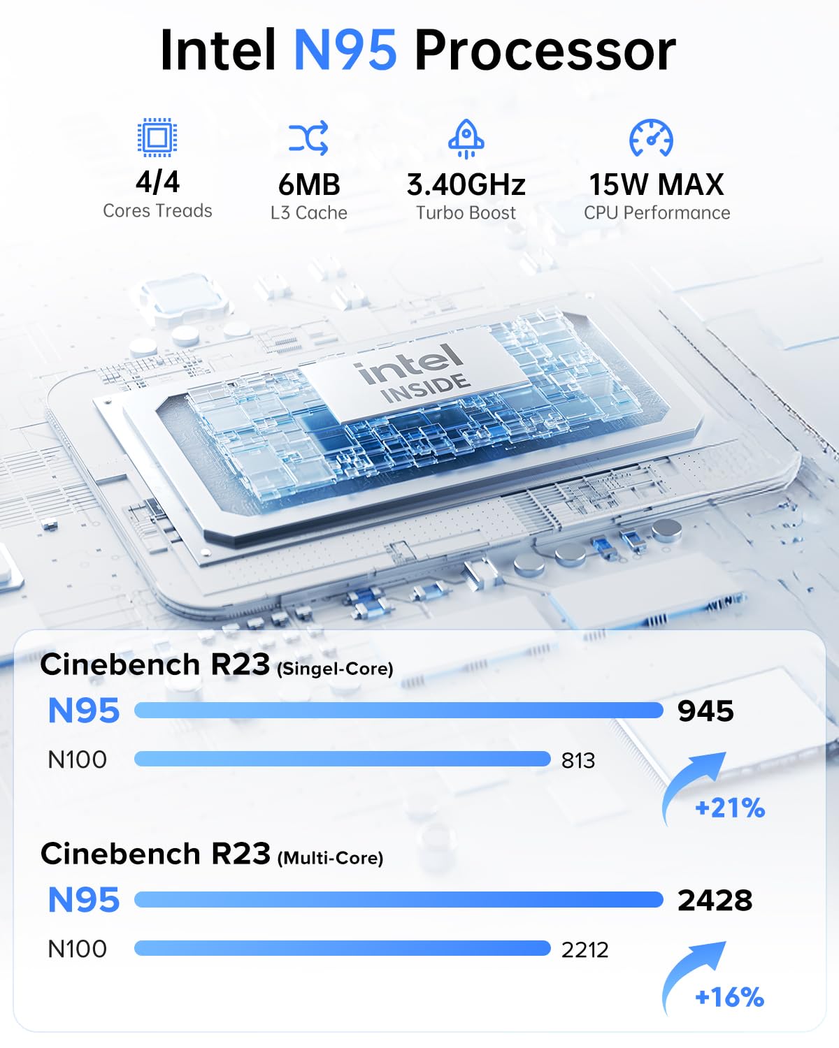 - Intel Alder Lake-N95 Prozessor: Ausgestattet mit einem modernen Intel Prozessor der 12. Generation, der mit 4 Kernen, 4 Threads und einer Taktfrequenz von bis zu 3,4 GHz eine deutliche Leistungssteigerung gegenüber Vorgängermodellen bietet.