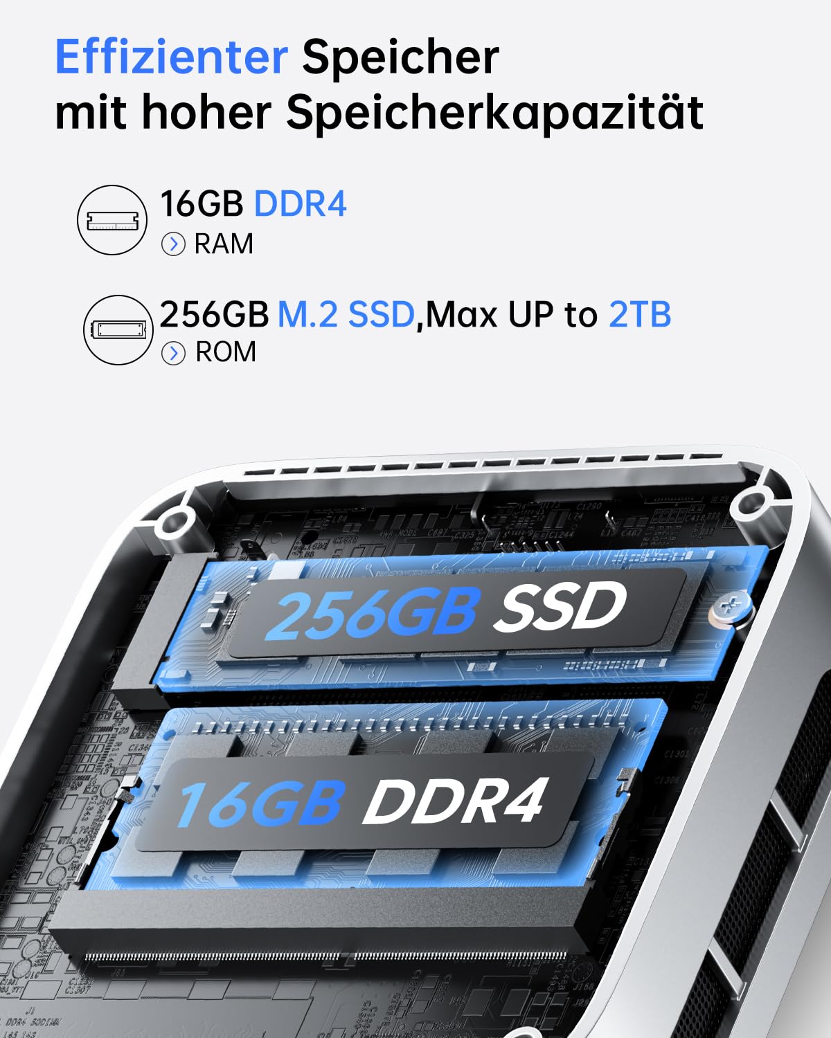 Sie können problemlos zwei Monitore gleichzeitig betreiben. Der Mini-PC verfügt über einen HDMI 2.0- und einen DisplayPort 1.4-Anschluss, die beide eine gestochen scharfe 4K-Auflösung bei 60 Hz unterstützen, um Ihre Produktivität zu maximieren.