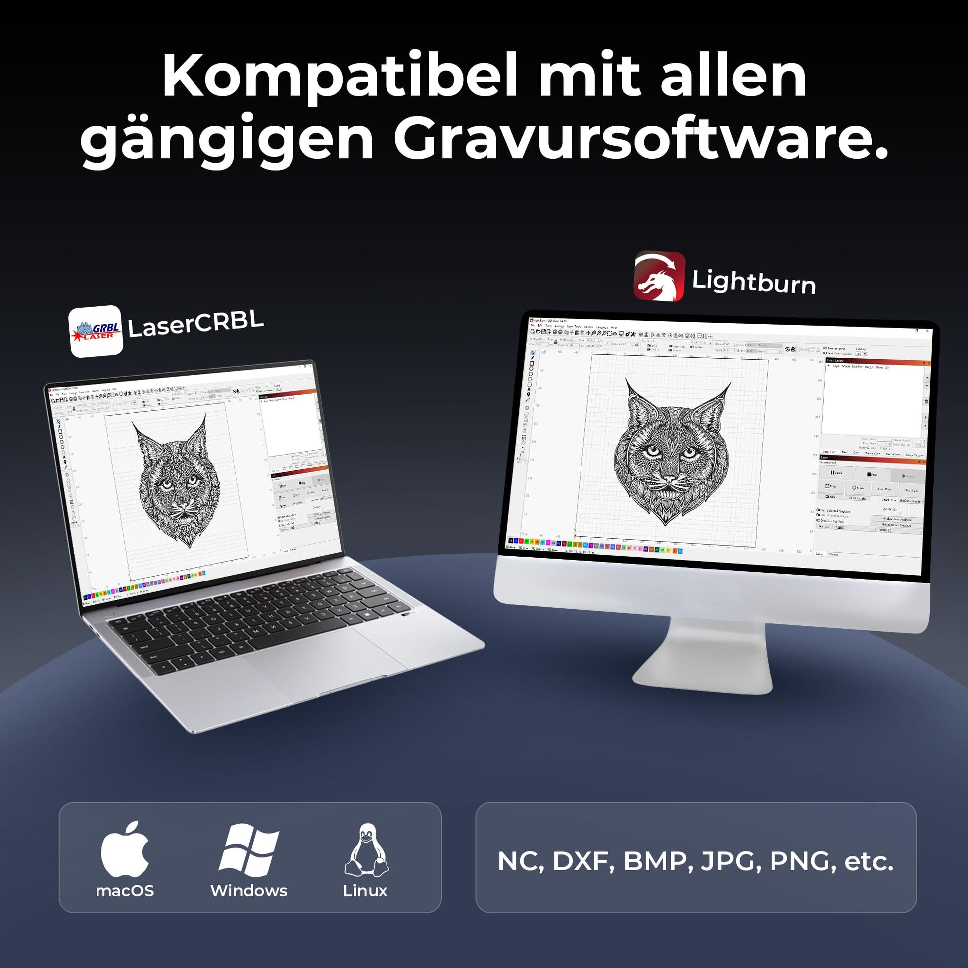 Der Lasercutter ist mit gängiger Gravursoftware wie dem kostenlosen LaserGRBL (für Windows) und der professionellen Software LightBurn (für Windows, macOS, Linux) kompatibel. Dies ermöglicht eine flexible und einfache Steuerung Ihrer Projekte.