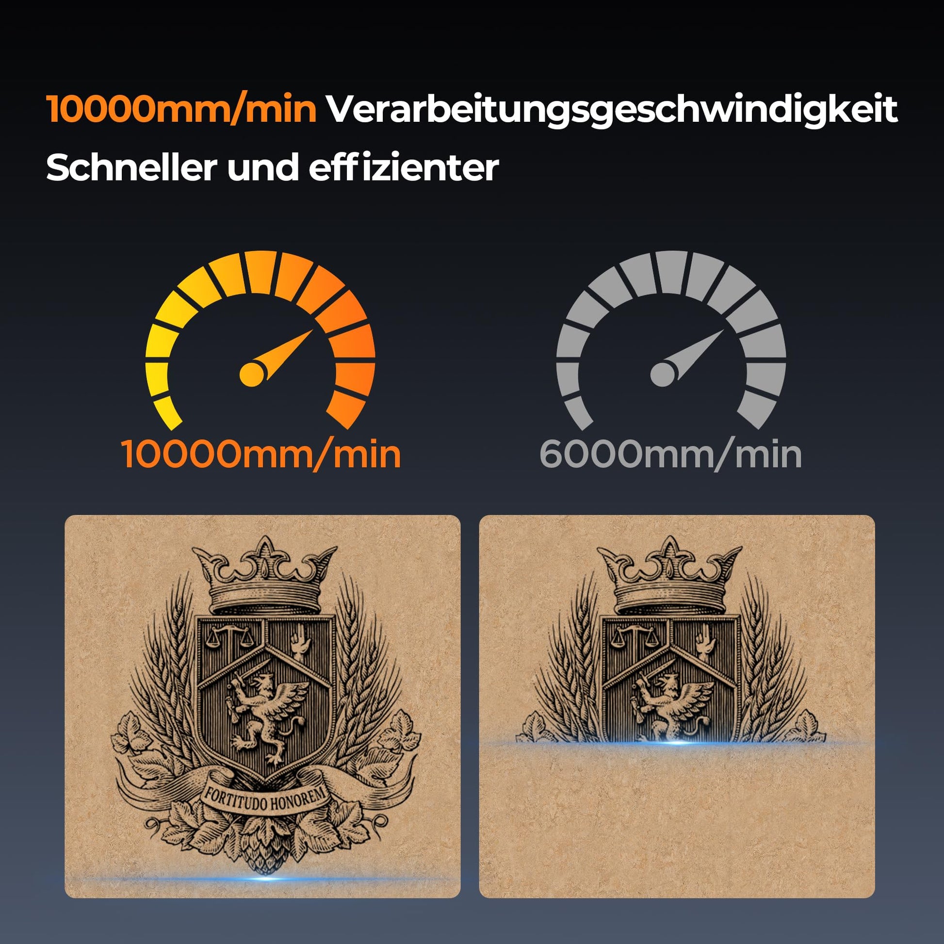 Der Lasercutter erreicht eine sehr hohe Präzision mit einer Laserpunktgrösse von nur 0,08 x 0,08 mm und einer Gravurgenauigkeit von 0,01 mm. Dabei arbeitet er mit einer beeindruckenden Geschwindigkeit von bis zu 10.000 mm/min, sodass auch feine Details scharf bleiben.