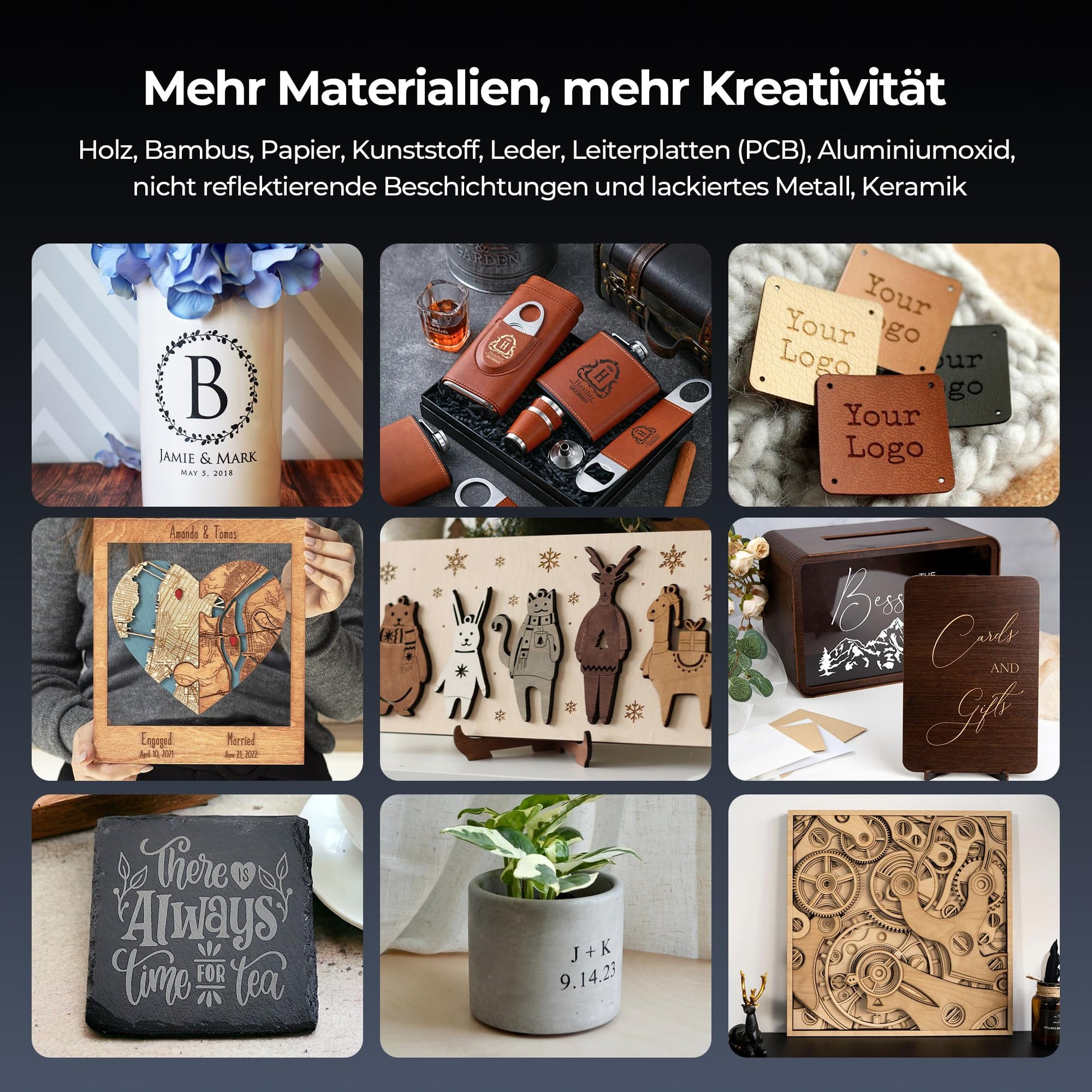 Dank der extrem hohen Präzision und Geschwindigkeit können Sie detailreiche Designs und filigrane Muster in kürzester Zeit umsetzen. Das ist perfekt für individuelle Geschenke, den Modellbau oder die Veredelung von Produkten. Die kraftvolle Schneidfunktion erweitert Ihre kreativen Möglichkeiten erheblich, indem Sie auch dickere Materialien wie Holz und Acryl bearbeiten können, um Prototypen oder Dekorationen herzustellen. Arbeiten Sie sicher und ungestört; der leise Betrieb und die umfassenden Sicherheitsmerkmale ermöglichen den Einsatz auch in ruhigen Umgebungen.
