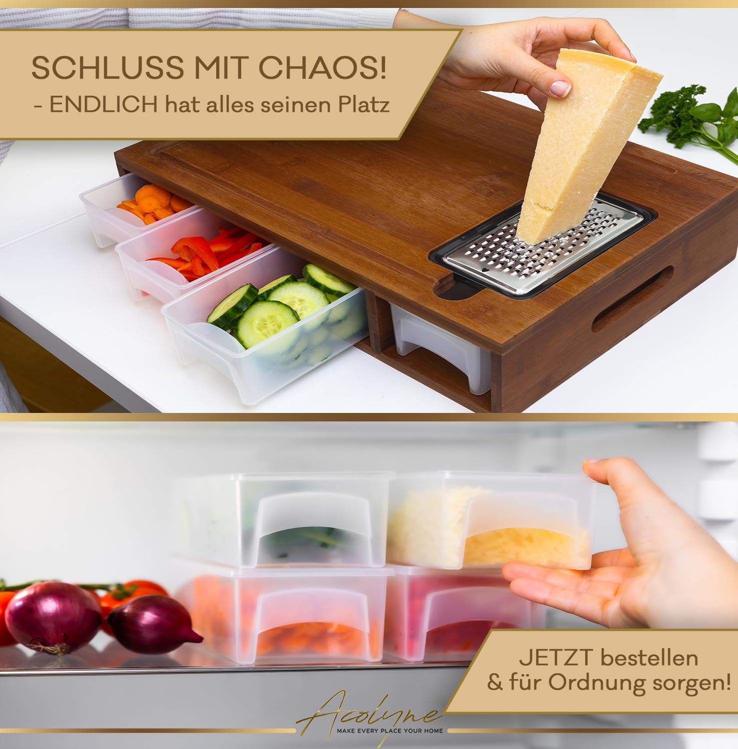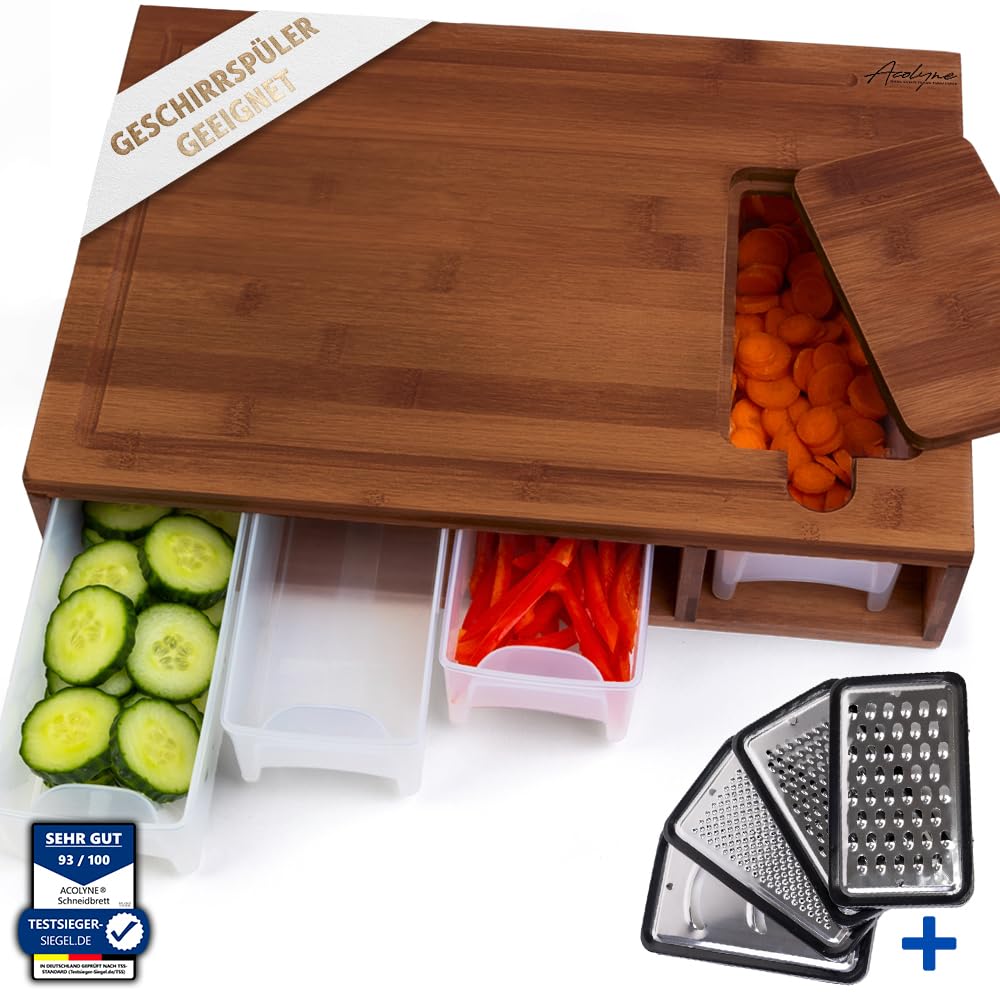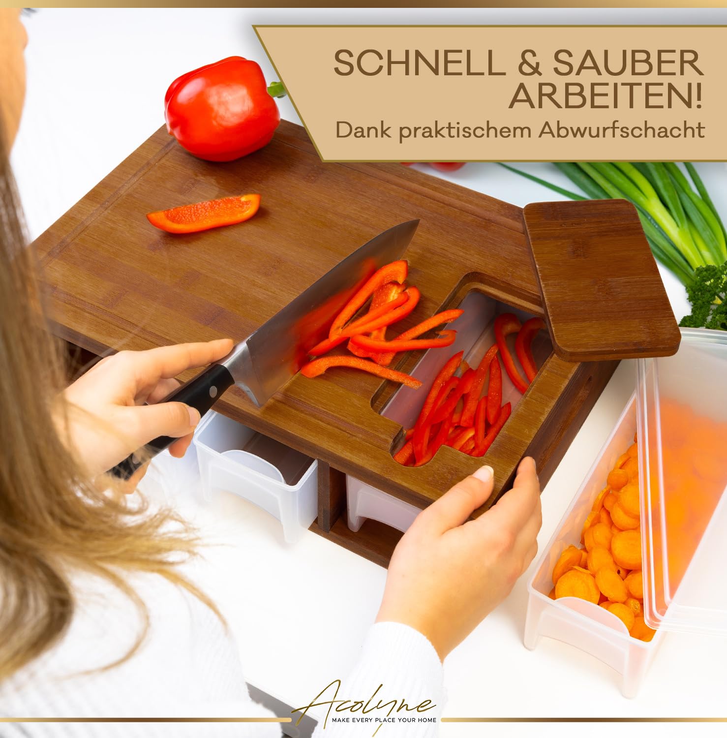 Der grösste Vorteil ist die enorme Arbeitserleichterung. Durch den integrierten Abwurfschacht können Sie geschnittene Zutaten oder Abfälle direkt in eine der vier ausziehbaren Auffangschalen schieben. Das sorgt für eine permanent saubere und organisierte Arbeitsfläche, verhindert das Herunterfallen von Lebensmitteln und ermöglicht eine hygienische Trennung.