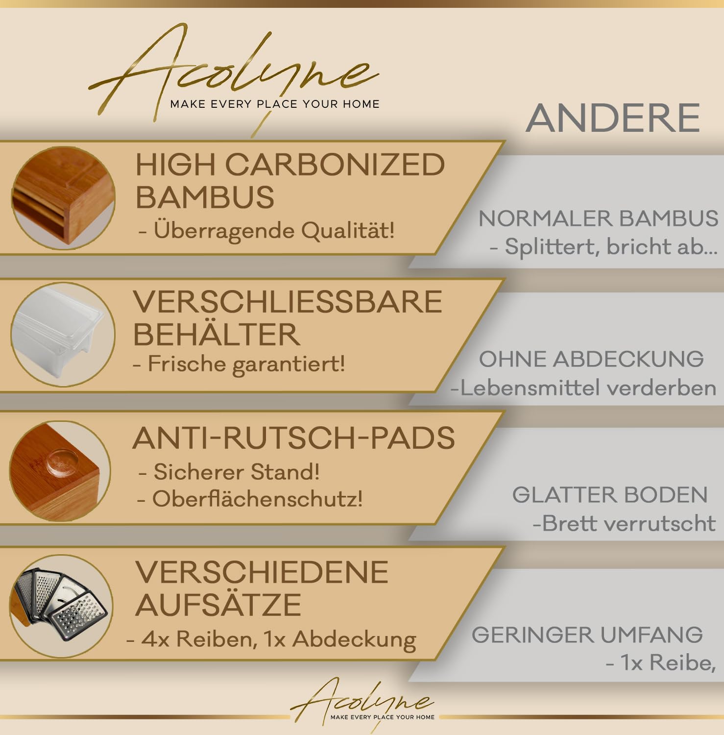 Acolyne XXL Schneidebrett mit 4 Auffangschalen – karbonisierter Bambus