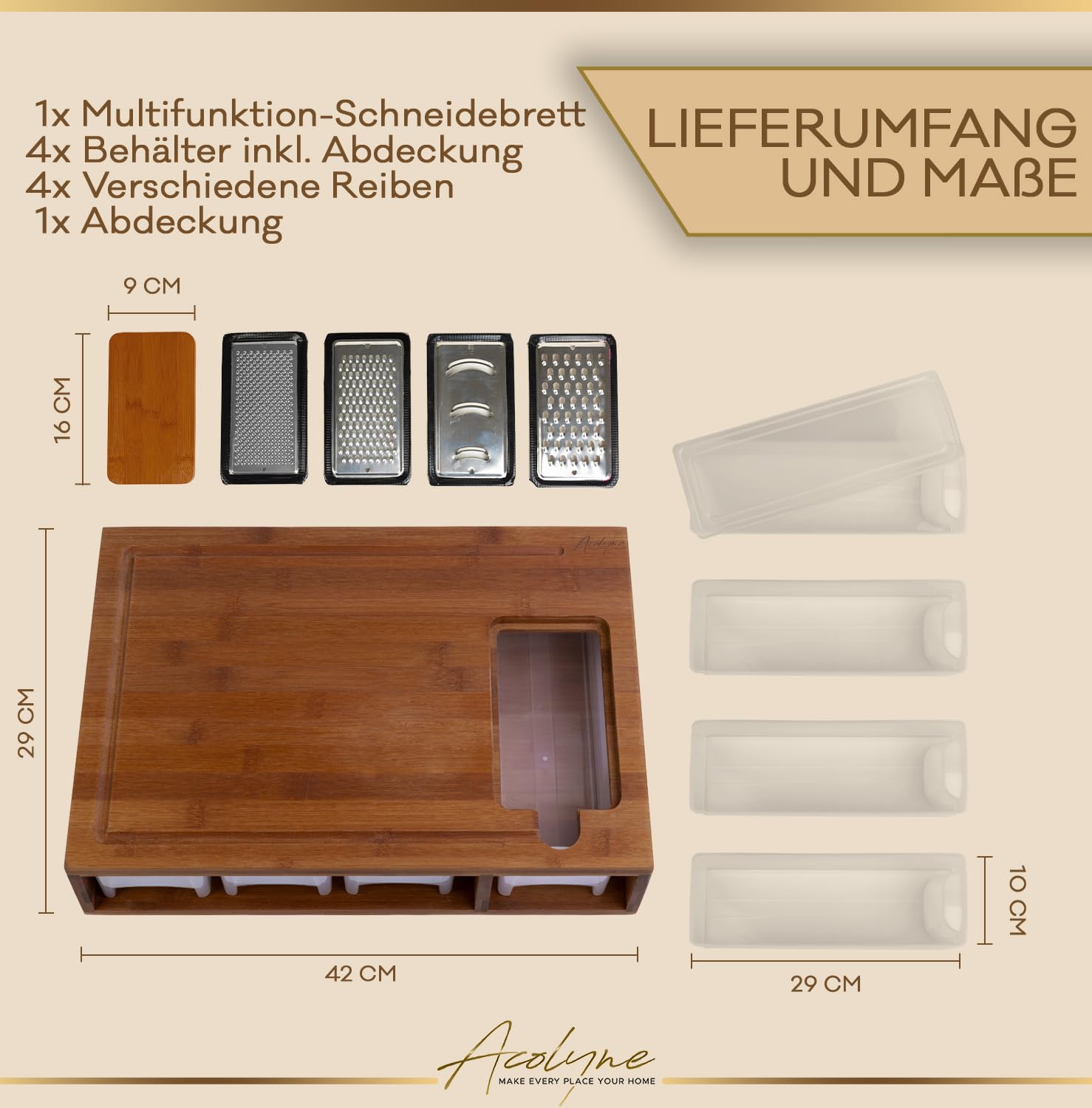 Das Set beinhaltet das XXL-Schneidebrett mit den Massen 42 x 29 x 9 cm (L x B x H), vier passgenaue Auffangschalen, ein Set mit vier praktischen Schäler-Aufsätzen sowie eine zusätzliche Holz-Abdeckung, mit der Sie den Abwurfschacht bei Bedarf verschliessen können.