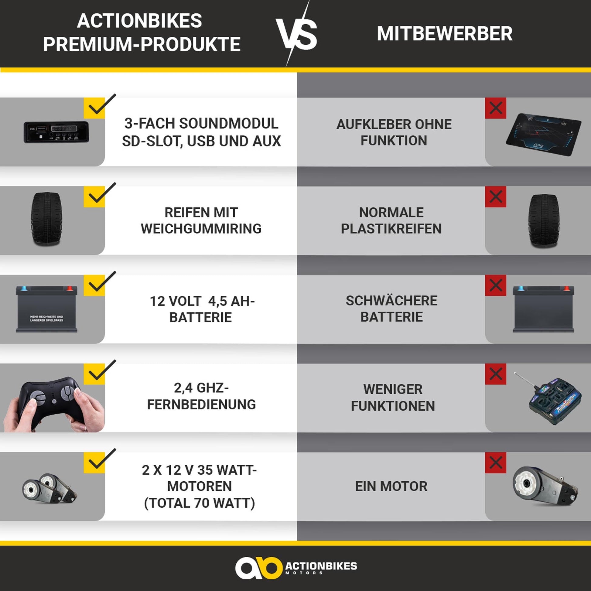 - Leistungsstarker Antrieb: Zwei 12V-Motoren mit einer Gesamtleistung von 70 Watt und ein 2-Rad-Antrieb ermöglichen Geschwindigkeiten von ca. 3 bis 6 km/h.
