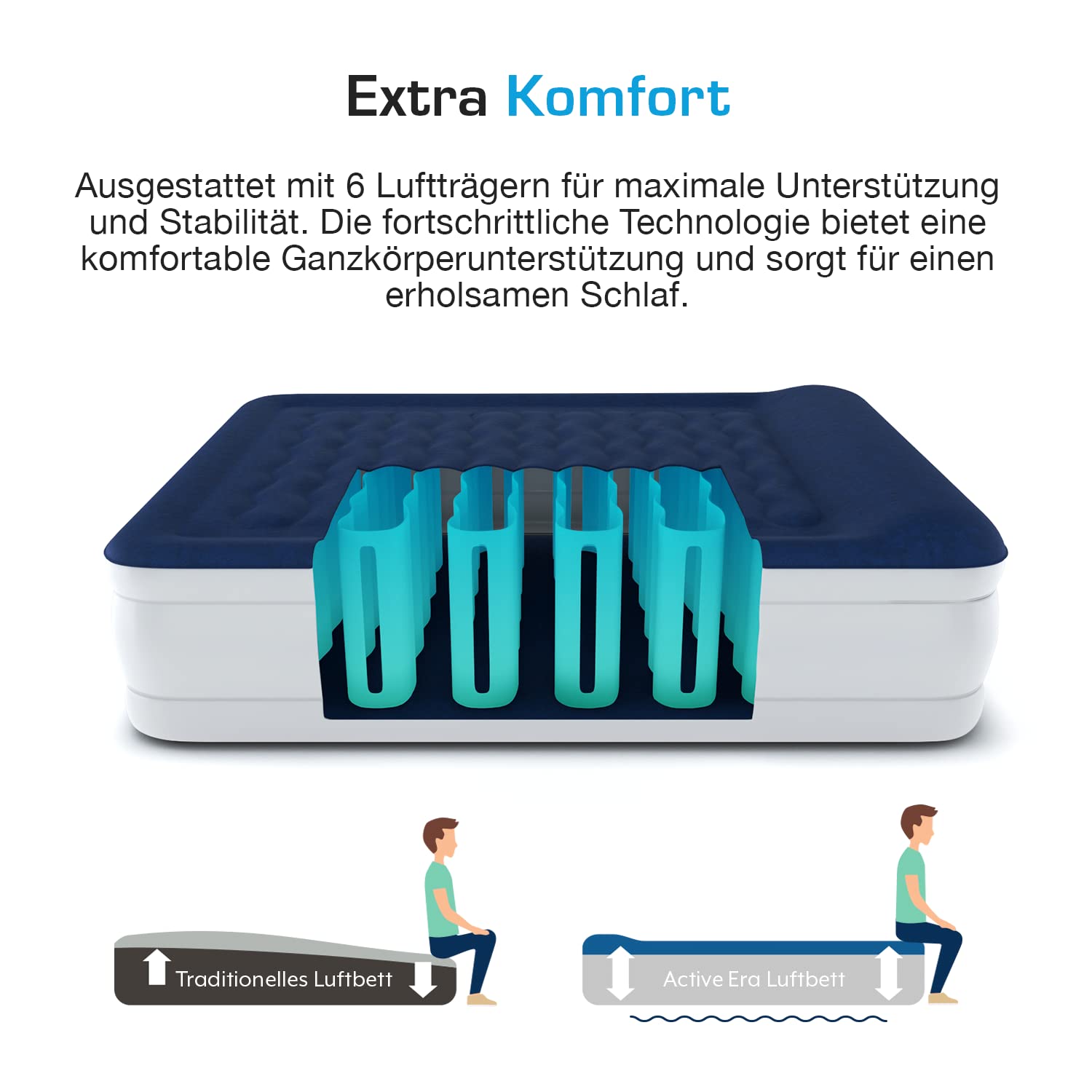 Erleben Sie erholsamen Schlaf, egal wo Sie sind. Das innovative Stützsystem verhindert das typische Durchhängen von Luftmatratzen und garantiert eine angenehme Nachtruhe. Dank der integrierten Pumpe ist das Bett im Handumdrehen einsatzbereit – ideal für spontane Gäste, den nächsten Campingausflug oder als komfortable Liegefläche im Auto.