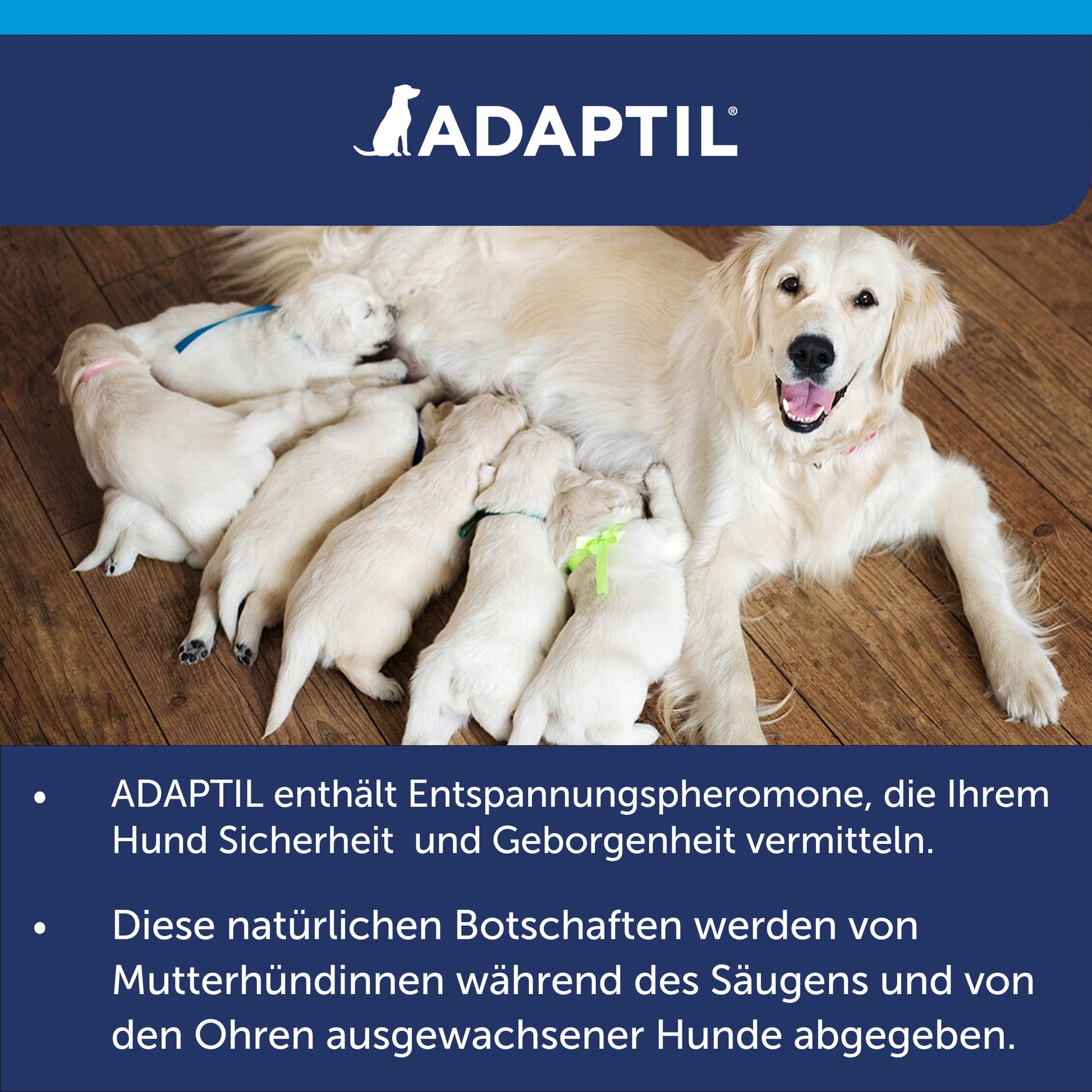 Stressige Ereignisse wie Feuerwerk, Gewitter, Partys oder laute Alltagsgeräusche können für Hunde eine grosse Belastung darstellen. ADAPTIL Calm hilft Ihrem Tier, in solchen Situationen spürbar entspannter zu bleiben. Die Pheromone vermitteln ein Gefühl von Sicherheit und Geborgenheit, wie es Welpen von ihrer Mutter kennen.