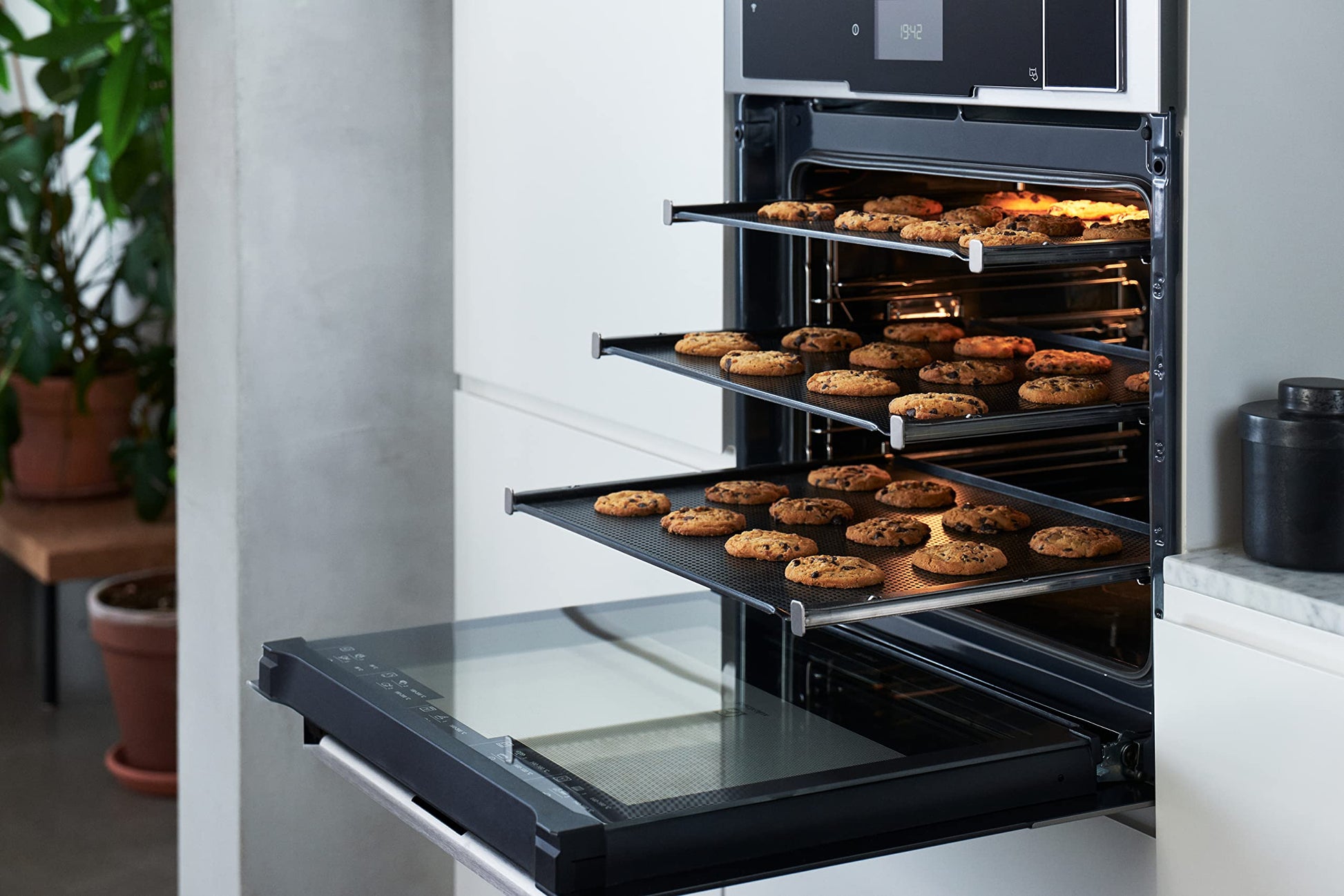 Die Schienen erhöhen die Sicherheit und den Komfort erheblich. Dank der stabilen Führung und einem integrierten Sicherheitsstopp können Sie heisse Backbleche sicher und ohne Ruckeln herausziehen, ohne dass diese kippen oder herausrutschen.