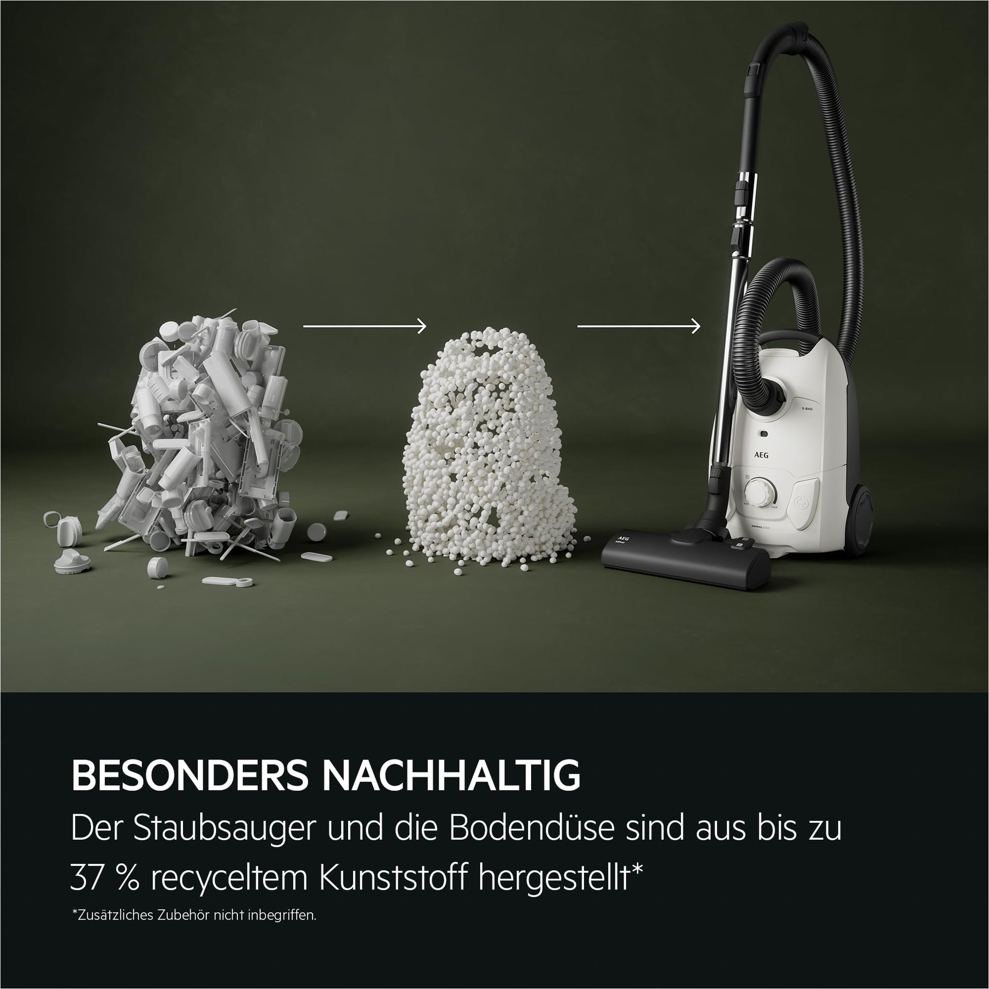 - Nachhaltige Materialien: Das Gehäuse des Staubsaugers und die Bodendüse sind aus bis zu 37 % recyceltem Kunststoff gefertigt.