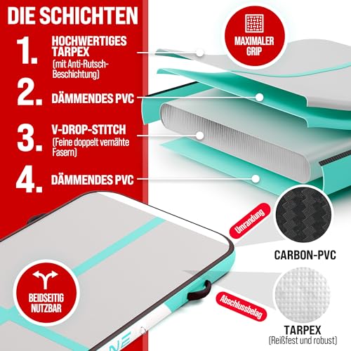 Entdecken Sie die aufblasbare Turnmatte von AERONE – Ihr perfekter Partner für Gymnastik, Akrobatik und Freizeitspass. Diese 4 Meter lange Airtrack Matte wurde entwickelt, um Ihr Training auf ein neues Niveau zu heben, egal ob Zuhause, im Freien oder sogar im Pool.