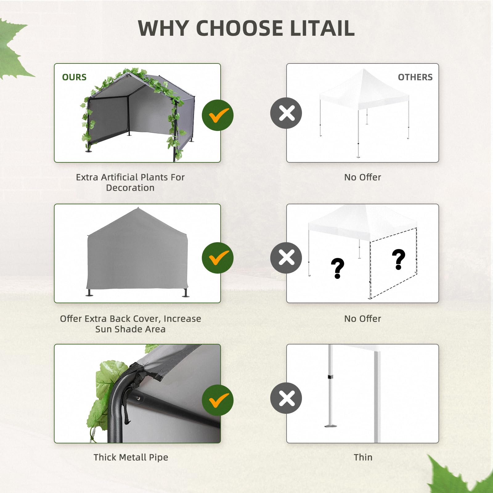 Die beiliegenden künstlichen Weinreben sind mehr als nur Dekoration. Sie werten das Zelt optisch auf und fügen sich harmonisch in die Gartenumgebung ein. Gleichzeitig verbessern sie die Isolierung und schaffen eine gemütliche, ruhige Umgebung, in der sich Ihr Tier sicher und wohlfühlt.