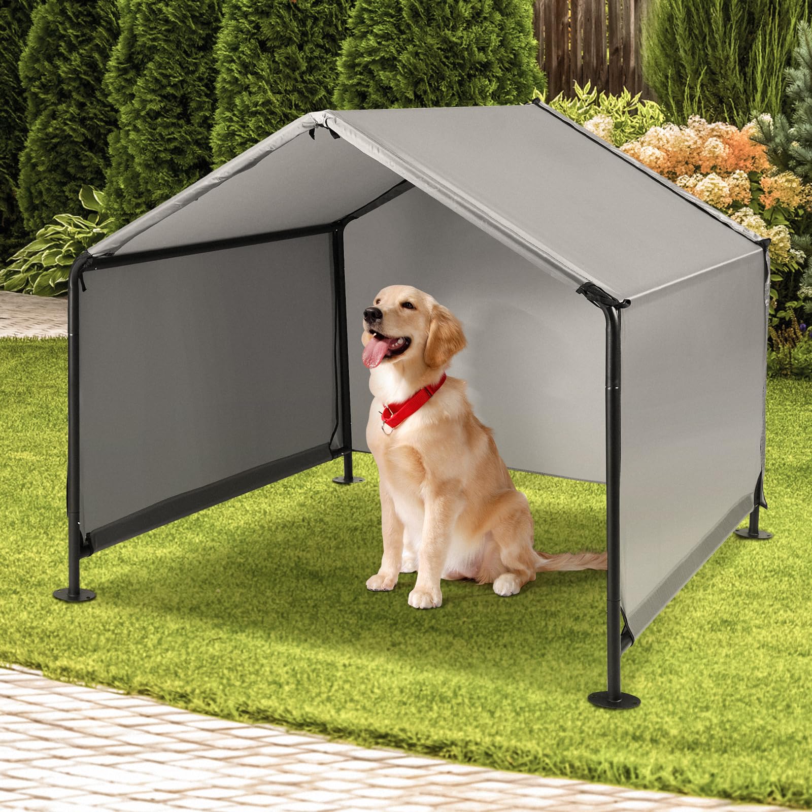 Für einen sicheren und stabilen Stand werden Bodenanker mitgeliefert. Das Zelt ist als offener Schutzraum ohne integrierten Boden konzipiert, was für eine gute Belüftung sorgt und es Ihrem Tier ermöglicht, direkt auf dem Rasen oder einer separaten Decke zu liegen.
