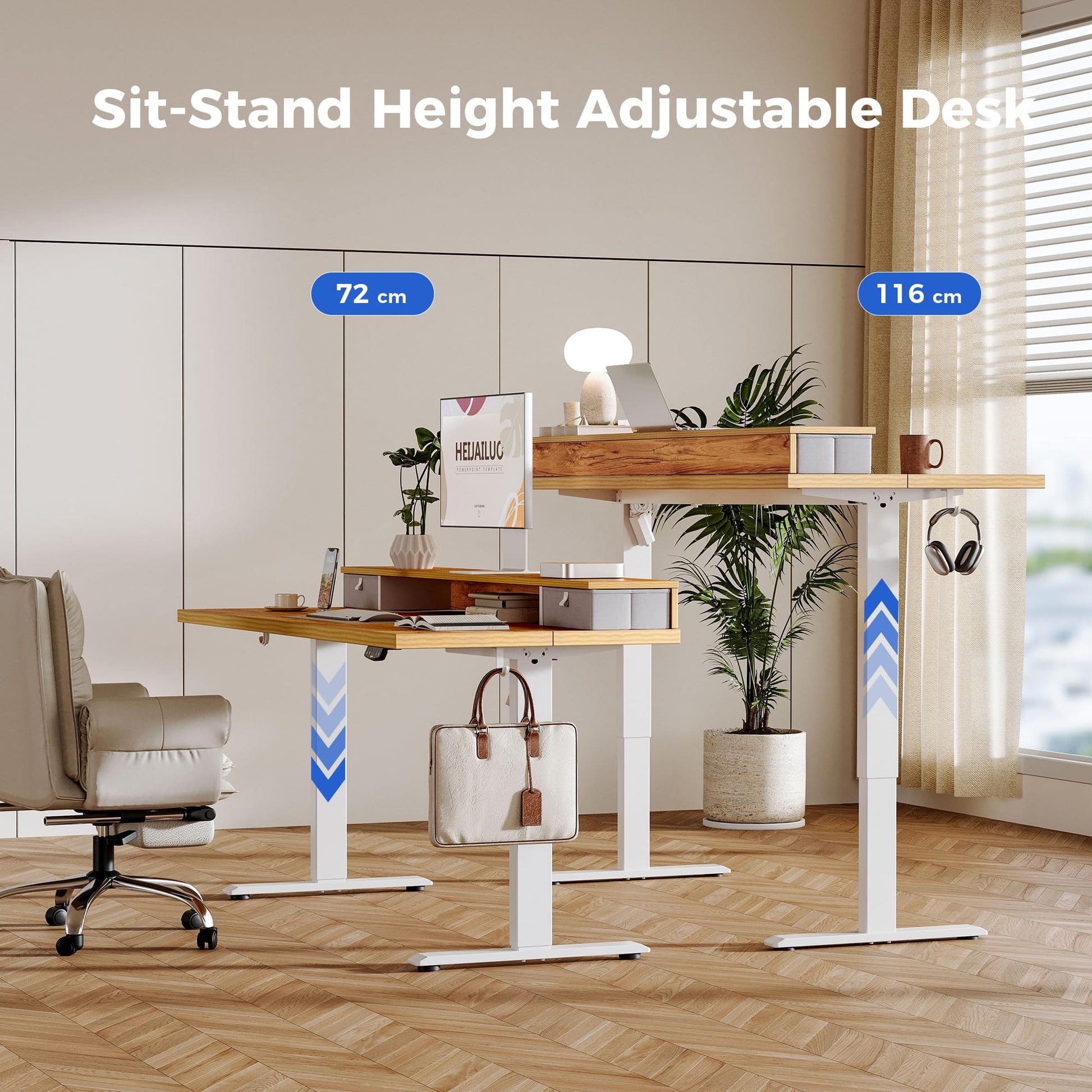 - Elektrische Höhenanpassung: Ein leiser Motor (unter 55 dB) ermöglicht die stufenlose Verstellung der Tischhöhe von 72 cm bis 116 cm. Zwei Speicherplätze erlauben das Sichern Ihrer bevorzugten Sitz- und Stehposition.