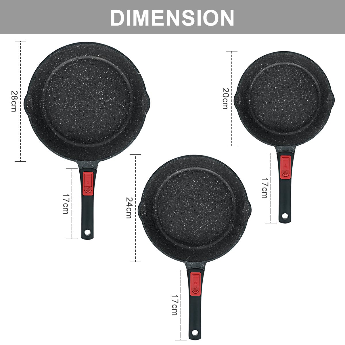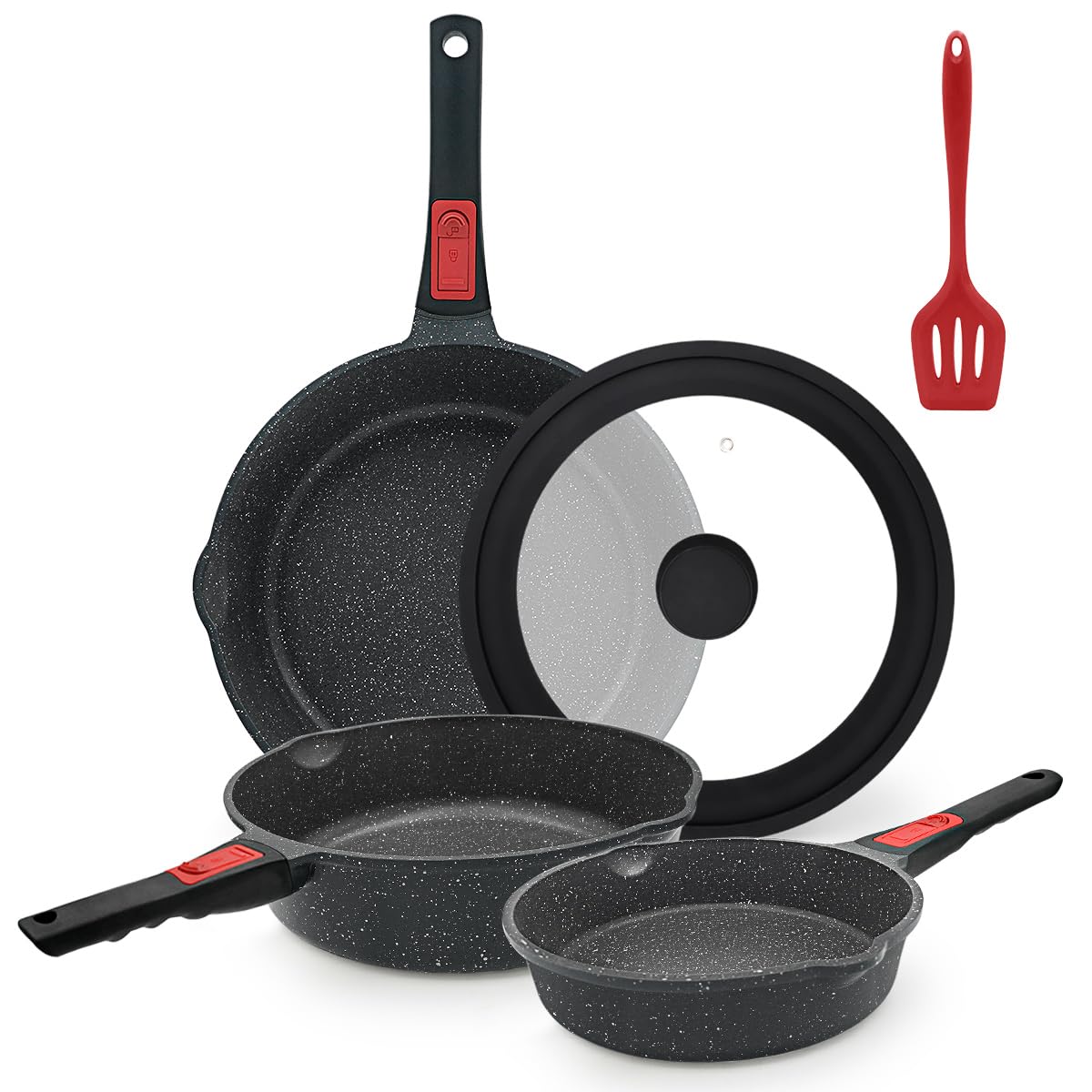 - Umfassendes 5-teiliges Set: Beinhaltet eine Pfanne mit 28 cm, eine mit 24 cm und eine mit 20 cm Durchmesser, einen Universaldeckel passend für alle drei Grössen sowie eine praktische Silikonschaufel.