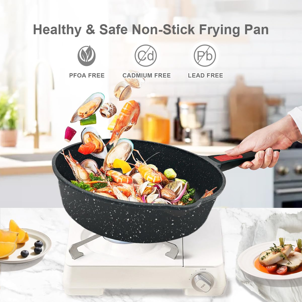 - Robuste Antihaft-Beschichtung: Die Oberfläche aus Granit ist widerstandsfähig und zu 100% frei von Schadstoffen wie PFOA, Blei oder Cadmium, was ein gesundes Kochen ermöglicht.