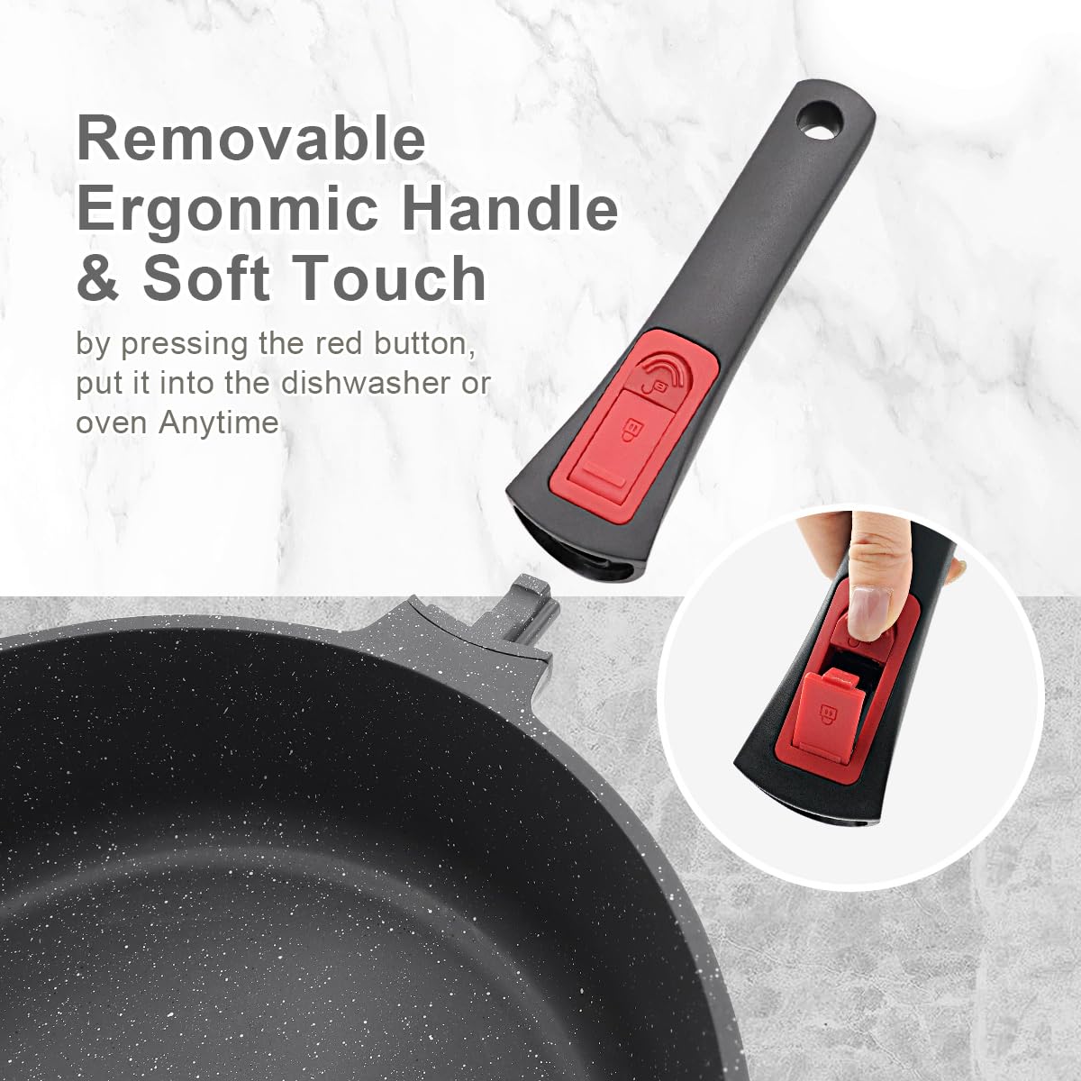 Der Griff lässt sich einfach per Knopfdruck anbringen und entfernen. Er wurde für eine stabile, wackelfreie Handhabung konzipiert, sodass Sie beim Kochen und Schwenken stets volle Kontrolle haben.
