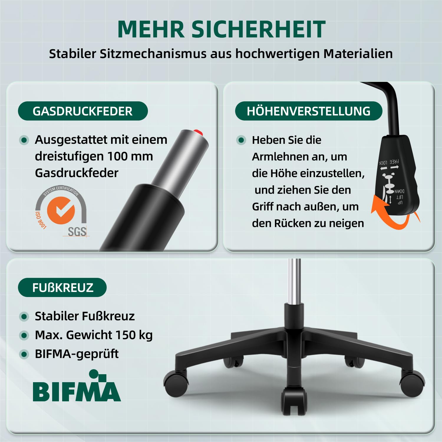 - Hohe Stabilität: Zertifiziert nach BIFMA und SGS, mit einer maximalen Belastbarkeit von 150 kg.
