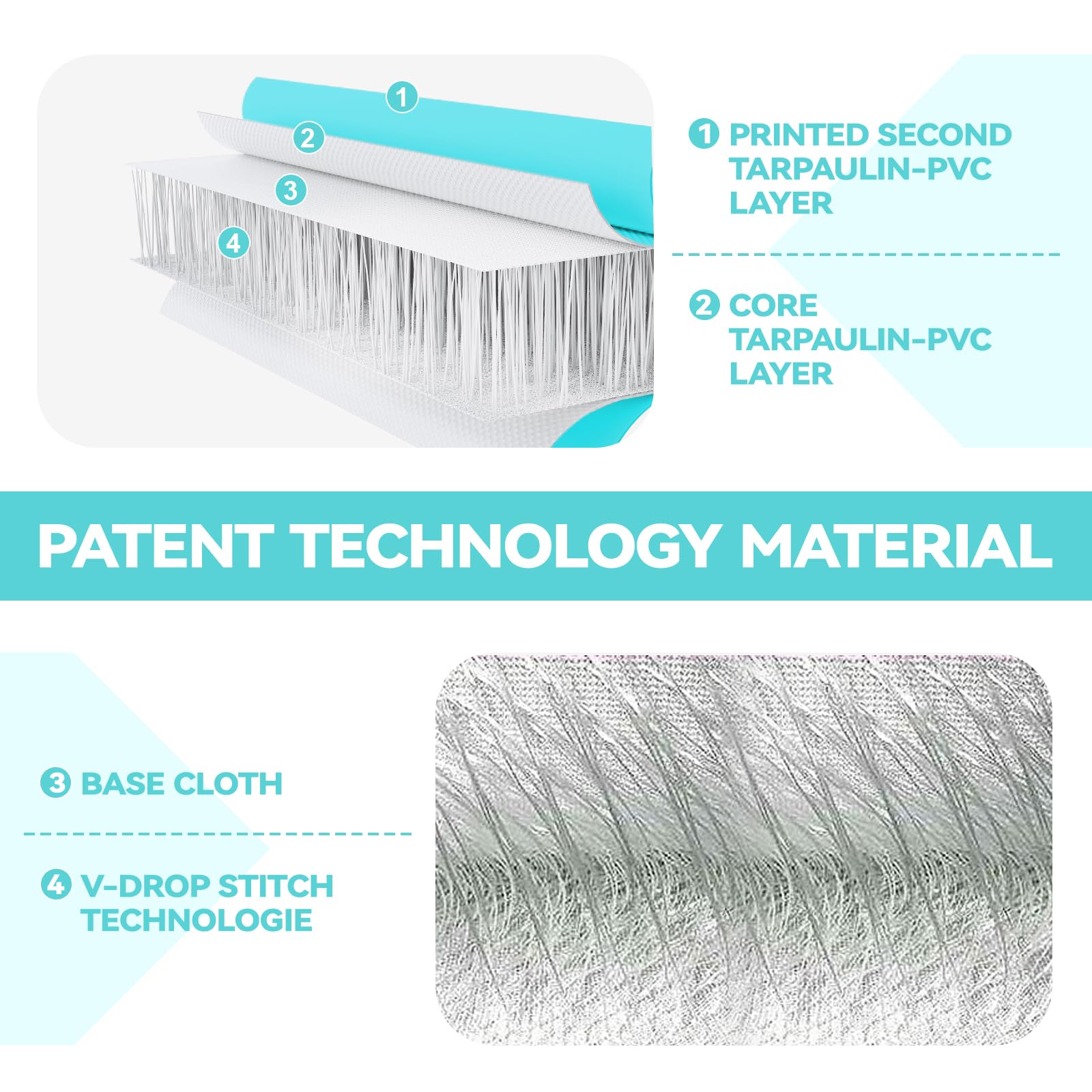 Die Matte ist extrem robust, gefertigt aus 0.9 mm dicker PVC-Plane und doppelwandigem Drop-Stitch-Gewebe. Alle Nähte sind sorgfältig verstärkt, um Luftverlust zu verhindern und eine aussergewöhnliche Langlebigkeit sowie maximale Stabilität zu garantieren.