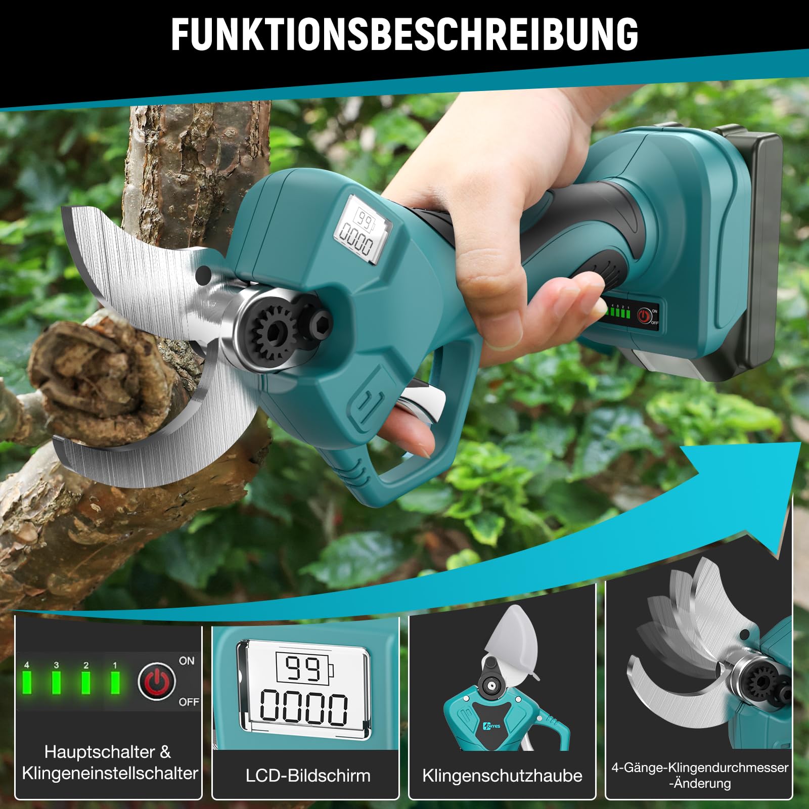 Diese professionelle Akku-Astschere ist das ideale Werkzeug für anspruchsvolle Gartenarbeiten. Sie wurde entwickelt, um Ihnen mit einem kraftvollen Schnitt und intelligenten Funktionen die Pflege von Sträuchern und Bäumen massgeblich zu erleichtern.