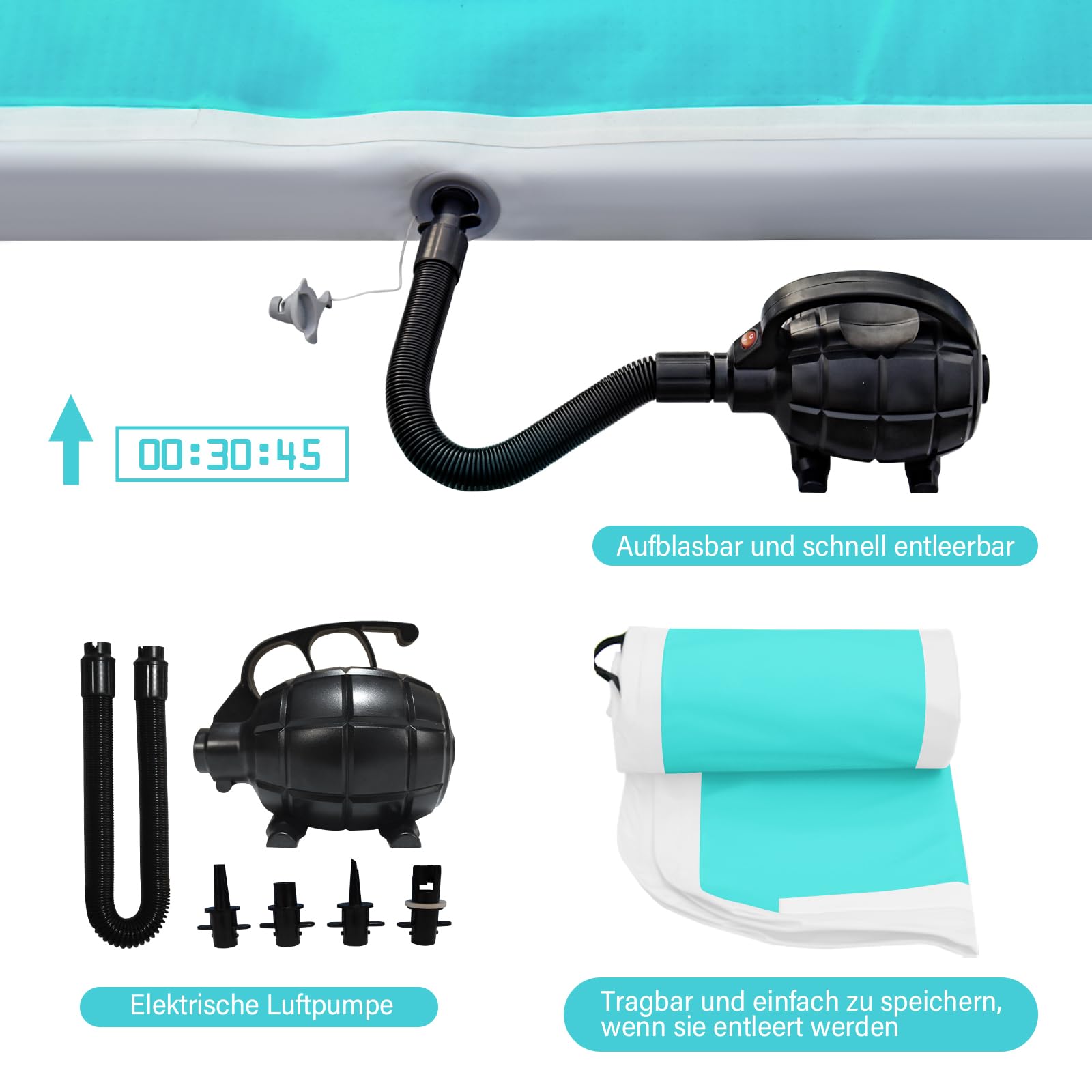 Mit der mitgelieferten elektrischen Pumpe ist die Matte im Handumdrehen einsatzbereit. Nach dem Gebrauch lässt sie sich ebenso schnell entleeren und kompakt in der praktischen Tragetasche verstauen – perfekt für den einfachen Transport und die platzsparende Lagerung.
