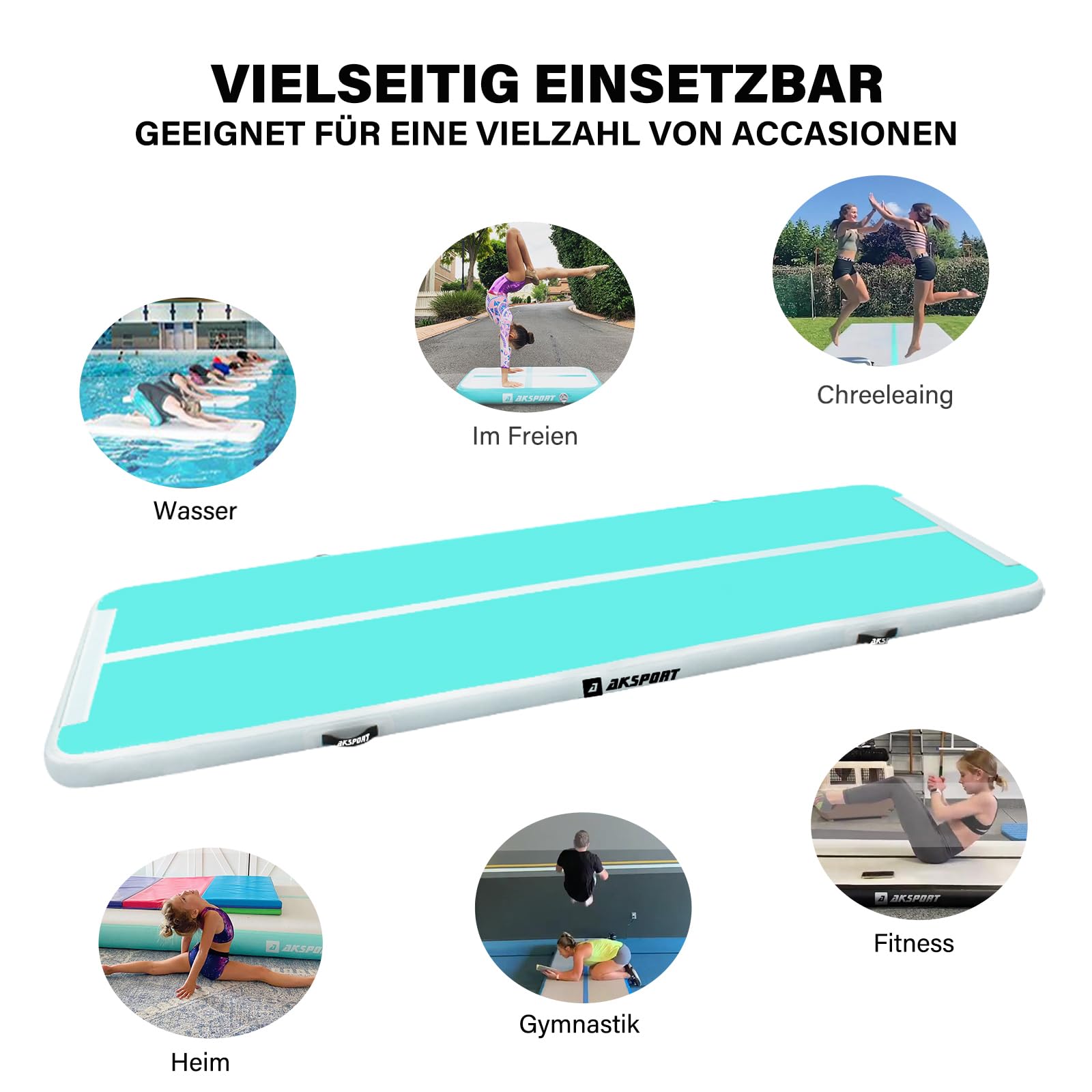 Die Matte ist ein vielseitiger Allrounder für Kinder, Jugendliche und Erwachsene. Sie eignet sich perfekt für Turnen, Gymnastik, Tumbling, Cheerleading und Yoga, aber auch als sichere Spielunterlage im Garten, am Strand oder sogar im Pool.