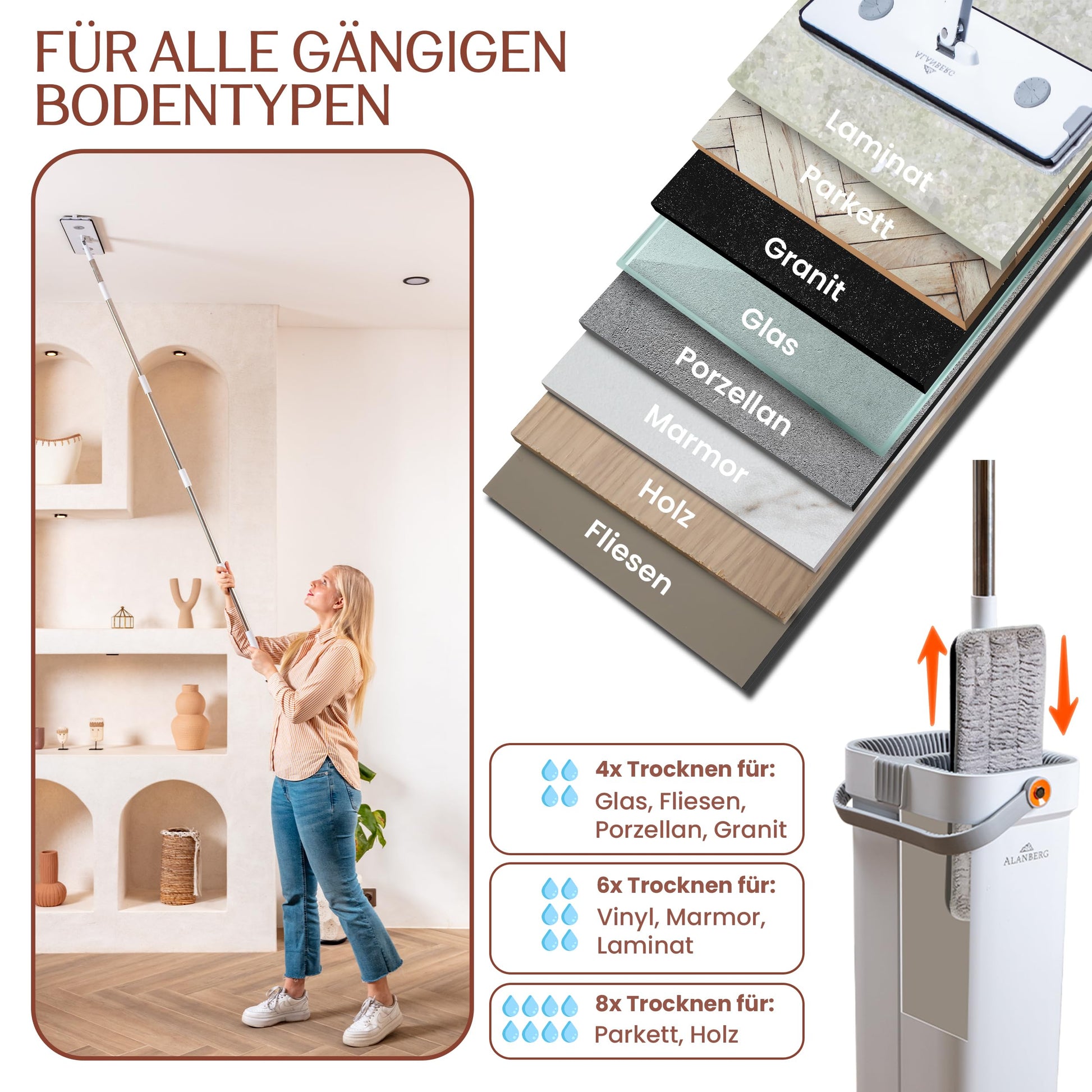 Das ALANBERG XL Wischmopp-Set ist ein Allrounder für alle glatten Hartböden. Sie können es bedenkenlos zur schonenden und effektiven Reinigung von Parkett, Laminat, Vinyl, Fliesen und Steinböden einsetzen.