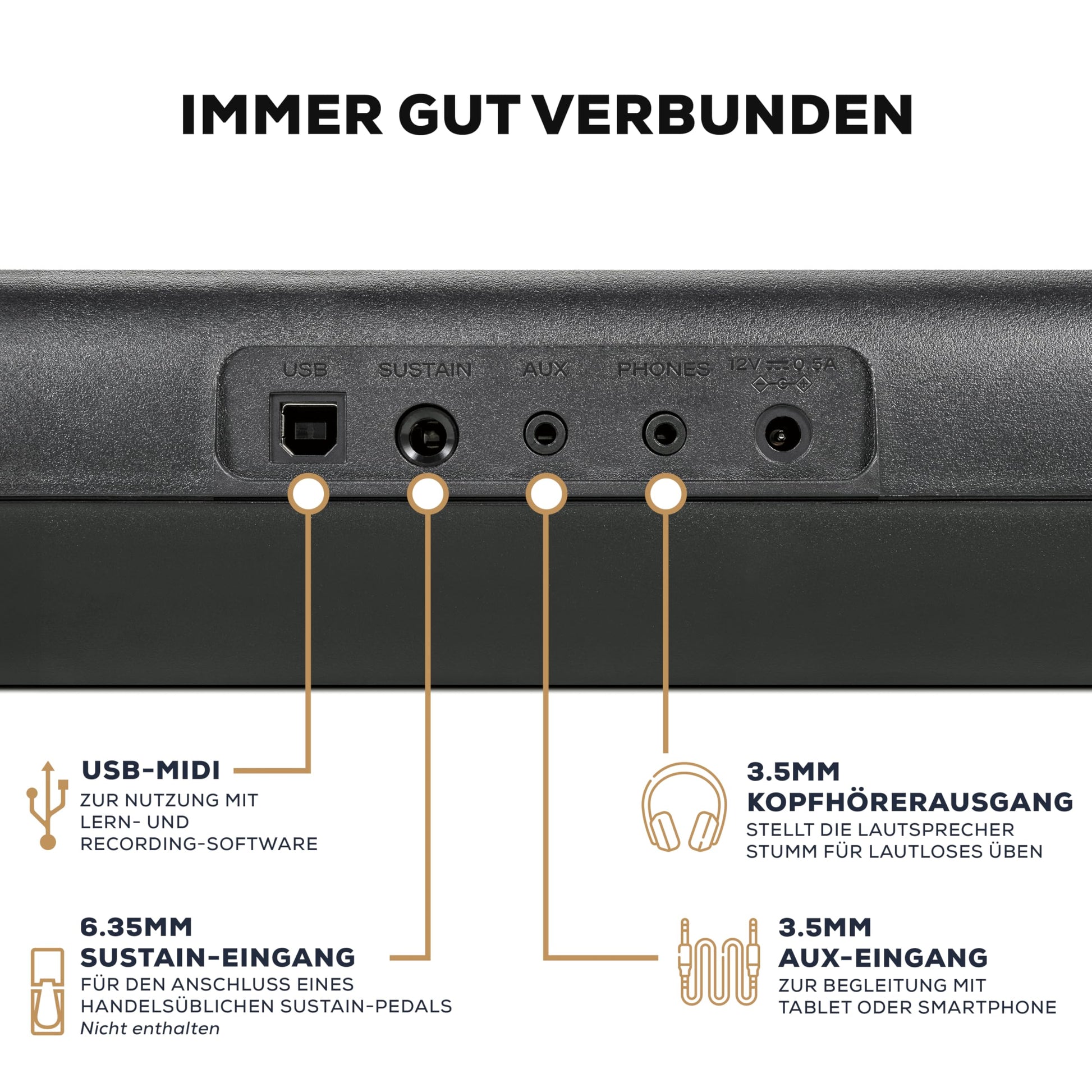 - Anschlüsse: USB-MIDI-Ausgang zum Verbinden mit einem Mac oder PC, 6.35mm Sustain-Pedaleingang, 3.5mm Aux-Eingang für Smartphones/Tablets, 3.5mm Kopfhörerausgang.