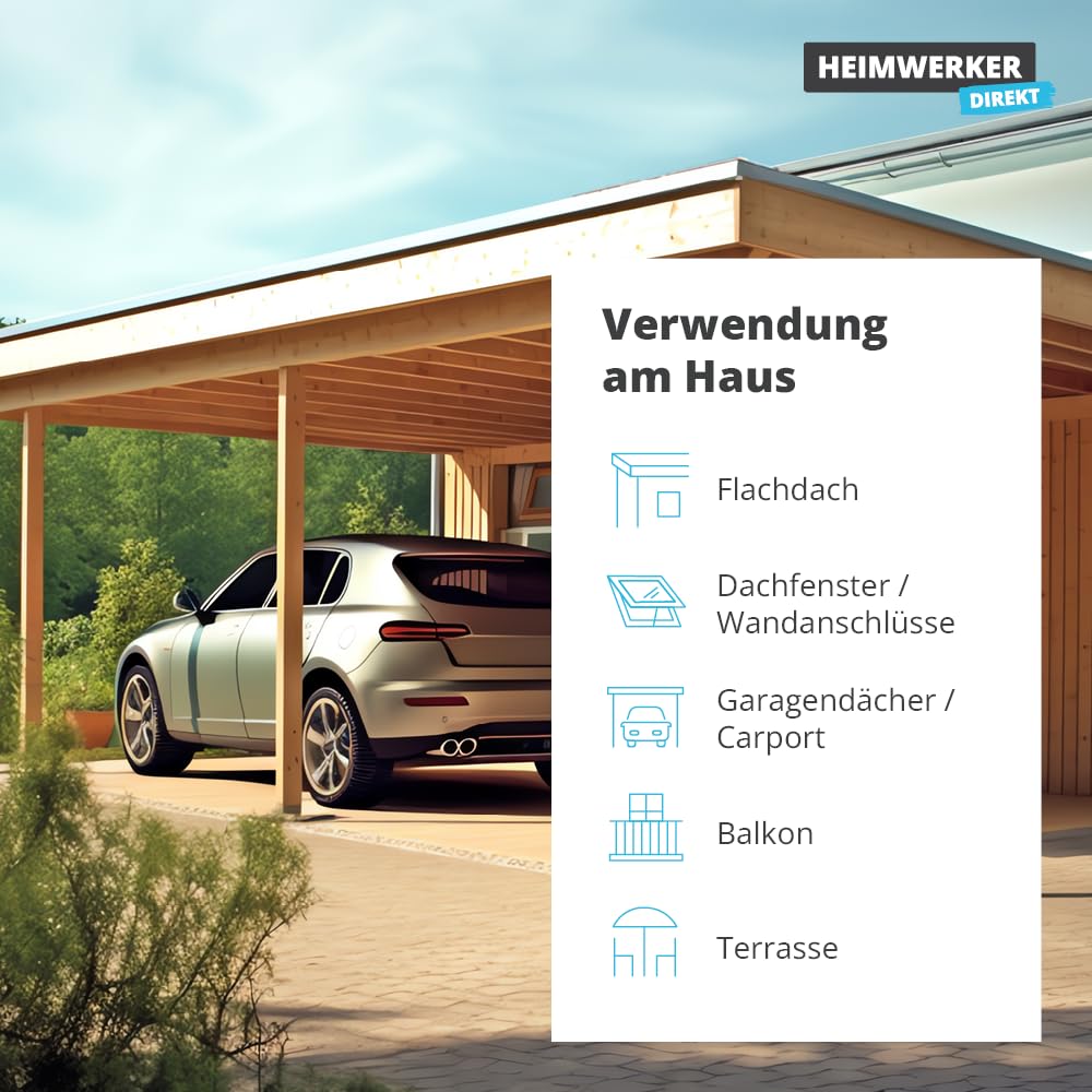 Der Flüssigdichtstoff ist ein flexibler Allrounder für diverse Bauvorhaben und eignet sich ideal für die Abdichtung von Flachdächern, Garagen, Terrassen und Carports. Er haftet ausgezeichnet auf vielen gängigen Untergründen und kann sowohl auf horizontalen als auch auf vertikalen Flächen angewendet werden.