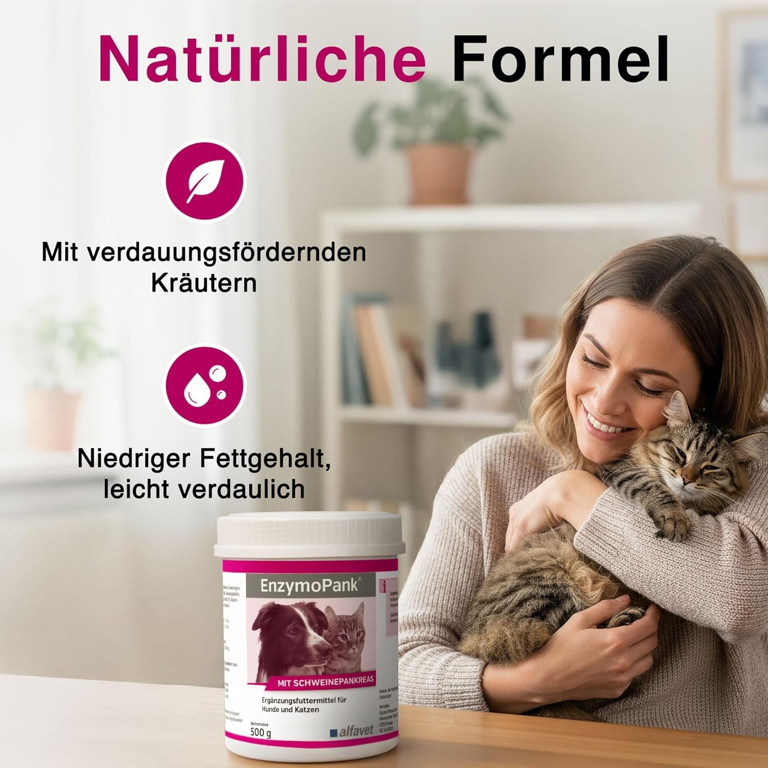 alfavet EnzymoPank ist ein speziell entwickeltes Ergänzungsfuttermittel in Pulverform, das die Verdauung Ihres Hundes oder Ihrer Katze bei einer Funktionsschwäche der Bauchspeicheldrüse gezielt unterstützt.