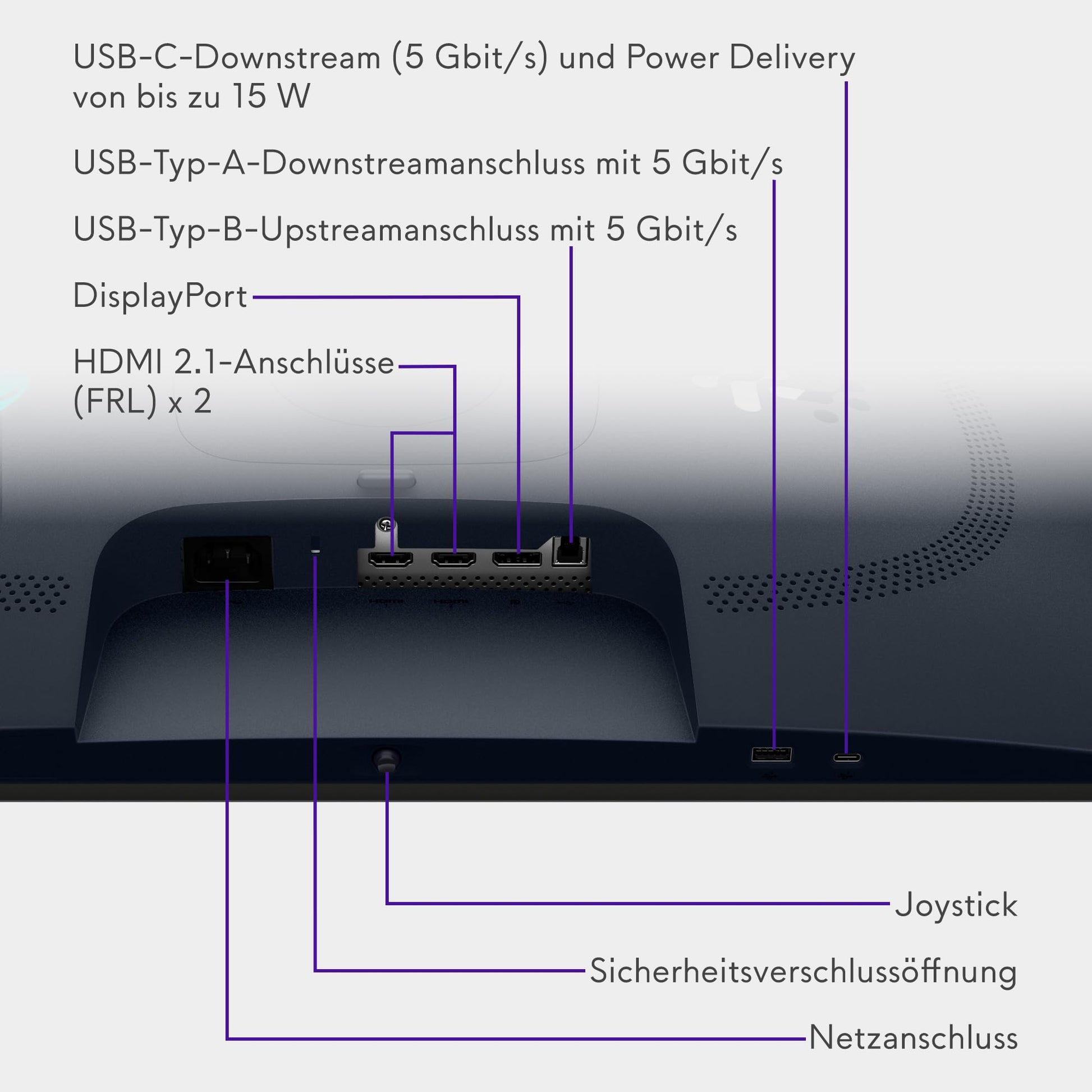 Der Monitor verfügt über moderne Anschlüsse wie DisplayPort 1.4, zwei HDMI 2.1-Ports und USB-C, was ihn sehr vielseitig macht. Dank HDMI 2.1 ist er auch ideal für aktuelle Konsolen wie die PlayStation 5 und Xbox Series X geeignet, um hohe Bildraten und andere Gaming-Features zu nutzen.