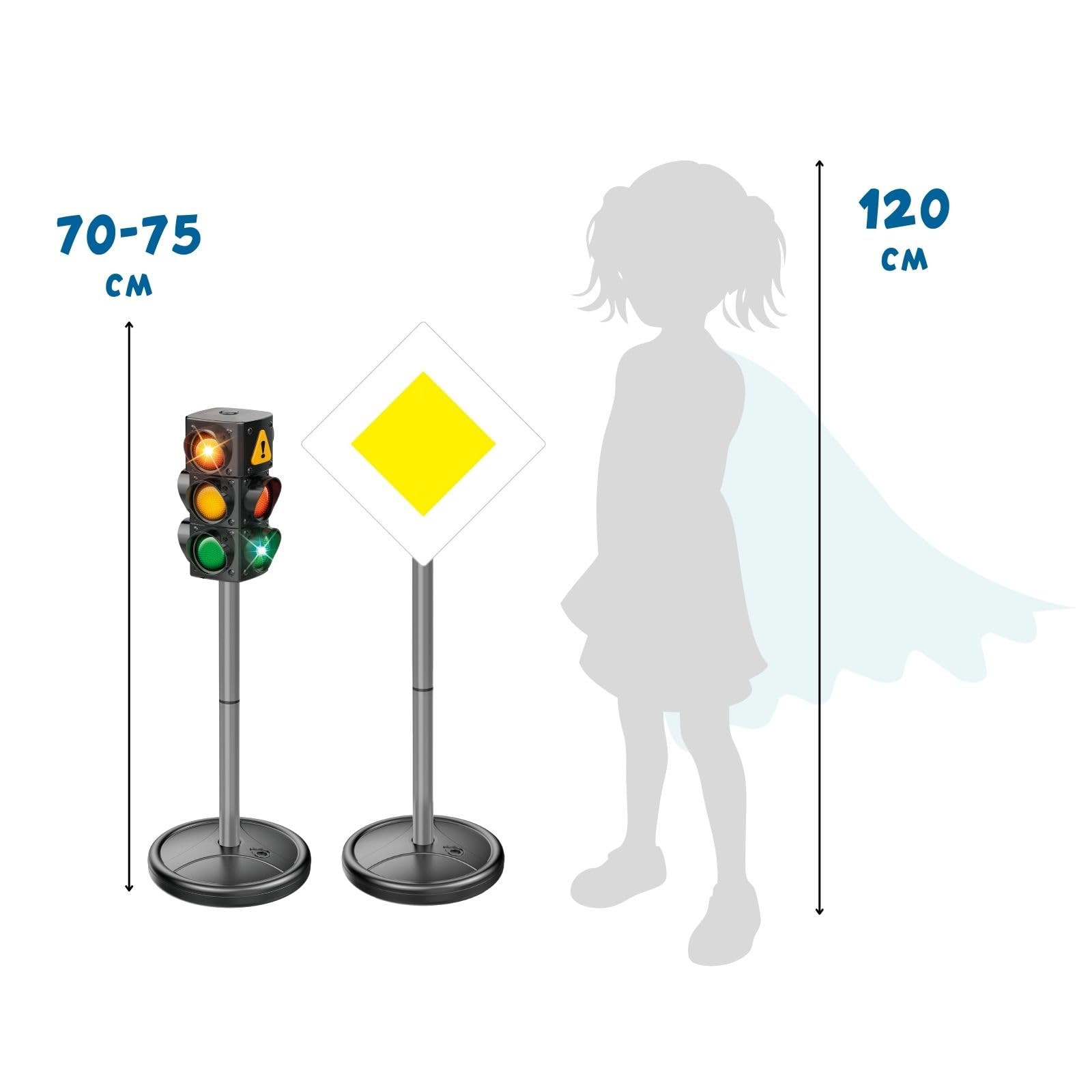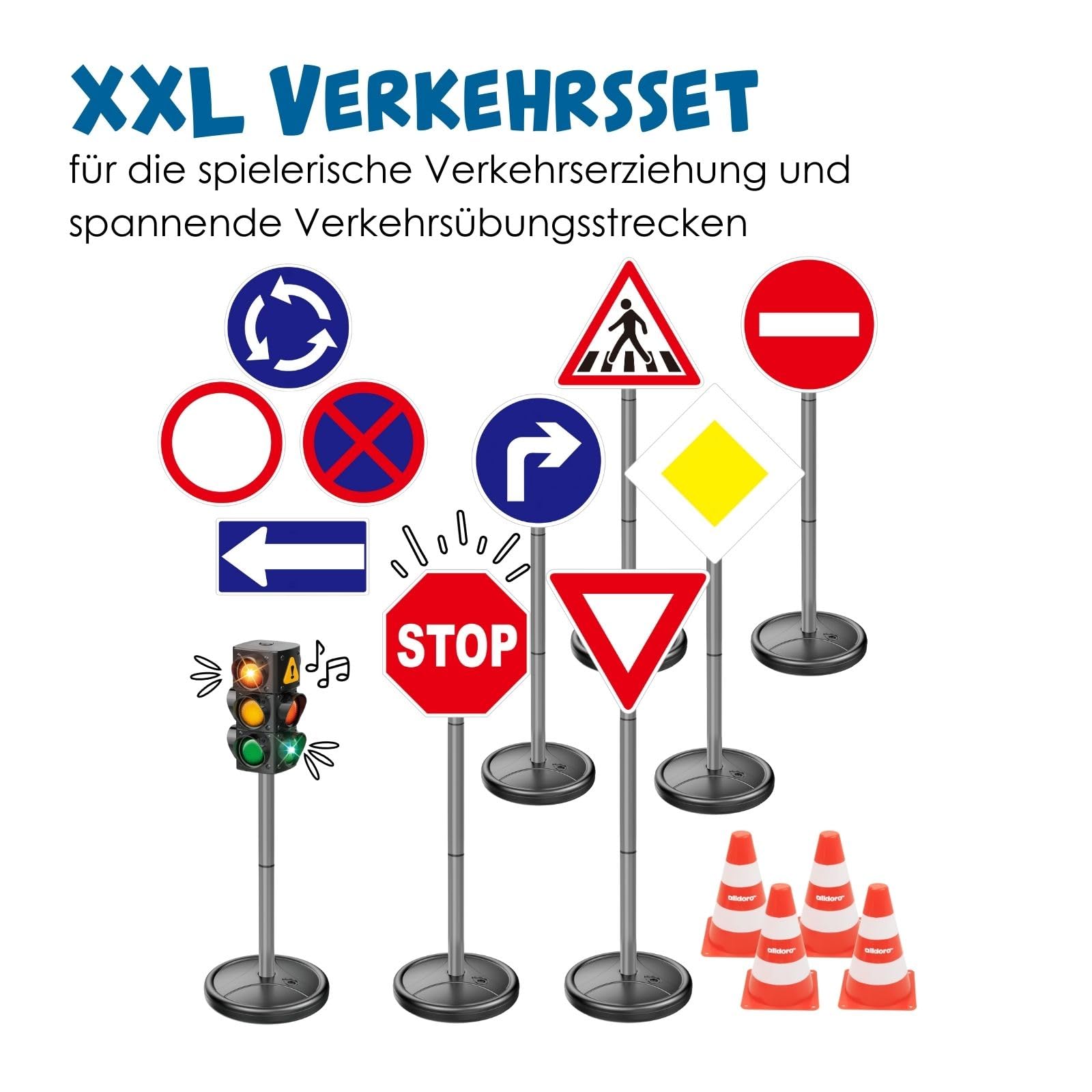 - Umfassendes Lernset: Beinhaltet eine 70 cm hohe Ampel, 10 verschiedene Verkehrszeichen (75 cm hoch) und 4 Pylonen für ein komplettes Spielerlebnis.
