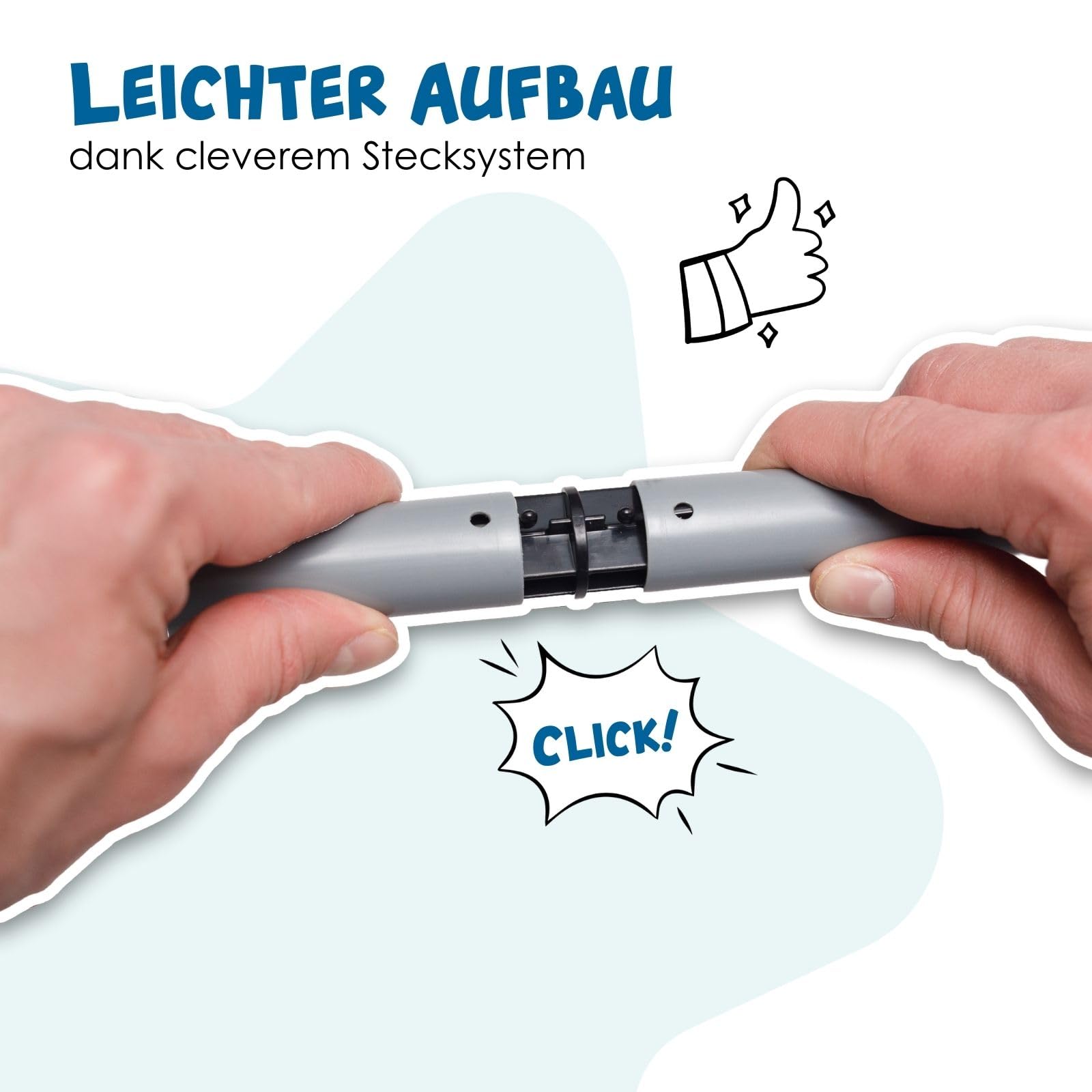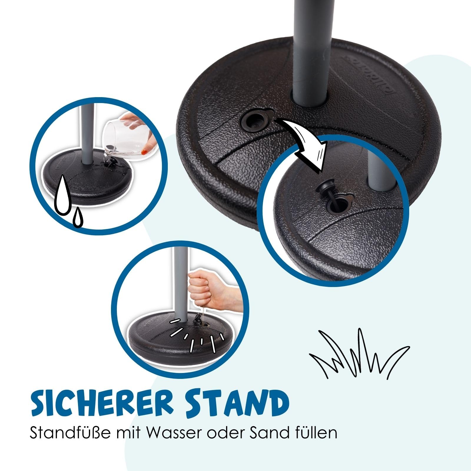 - Robuste Stabilität: Die Standfüsse der Elemente lassen sich mit Wasser oder Sand füllen. Dies sorgt für einen sicheren und festen Halt auf jedem Untergrund – perfekt für drinnen und draussen.