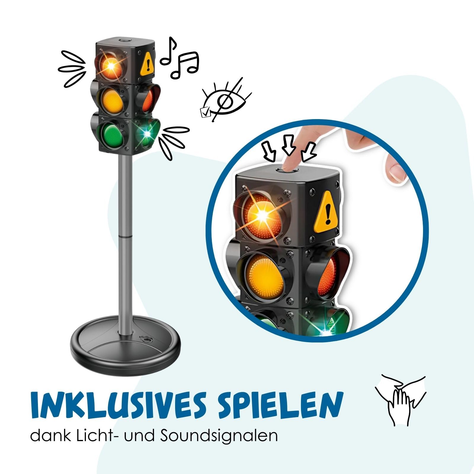 - Interaktive Ampel: Die batteriebetriebene Ampel verfügt über realistische Licht- und Geräuscheffekte und kann sowohl automatisch als auch manuell die Rot-, Gelb- und Grünphasen durchschalten.