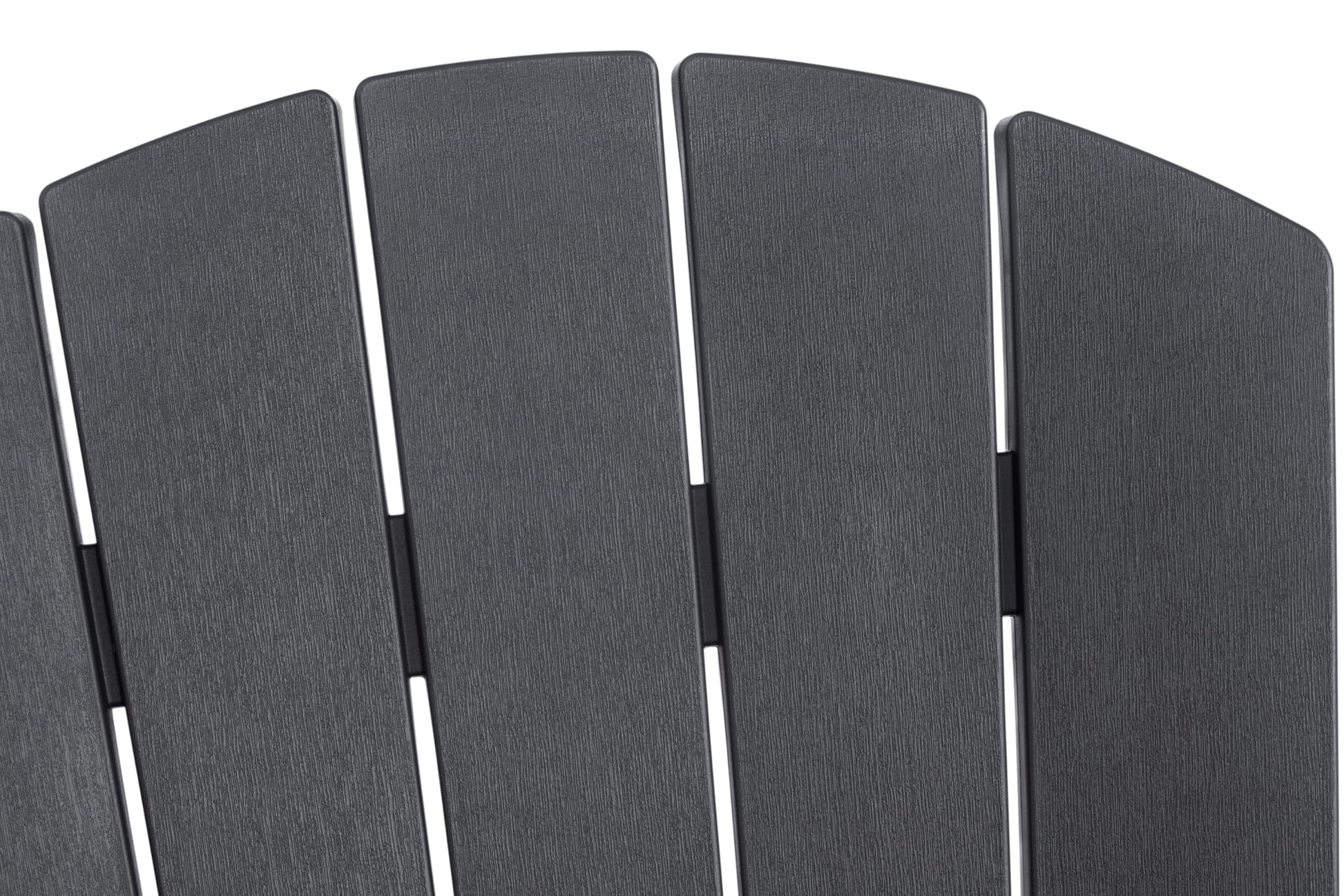 Der Sessel ist aus hochwertigem, langlebigem Kunststoff gefertigt. Er besticht durch eine authentische Holzoptik in einem edlen Anthrazit-Farbton, die den Charme eines klassischen Holzstuhls mit der Langlebigkeit und Pflegeleichtigkeit von Kunststoff verbindet.