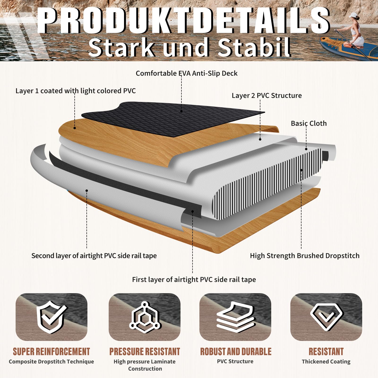 - Robuste Konstruktion: Gefertigt mit fortschrittlicher Pro-High-Density-Drop-Stitch-Technologie und einer hochdrucklaminierten PVC-Oberfläche für aussergewöhnliche Steifigkeit und Langlebigkeit.